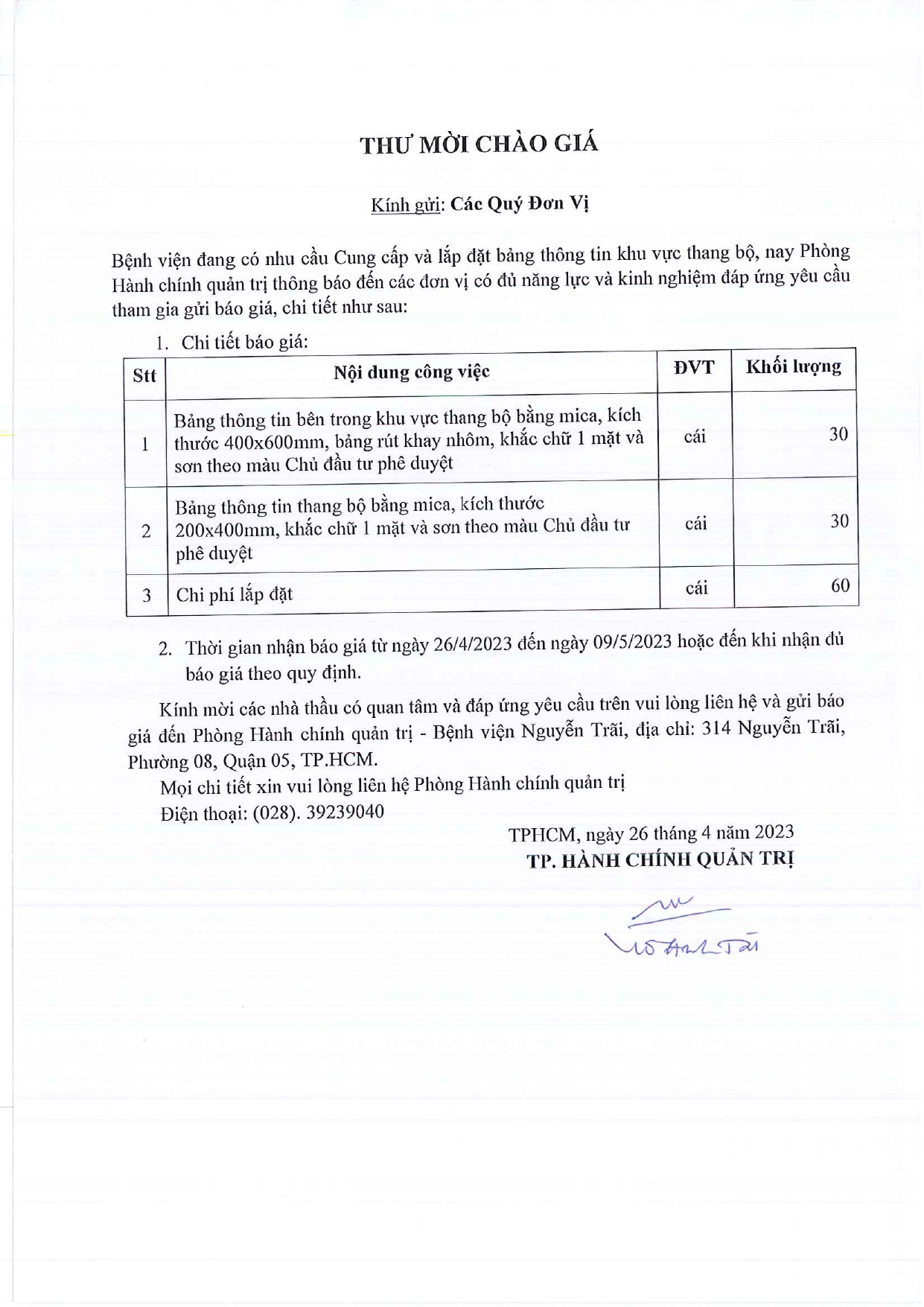 Thư mời chào giá cung cấp và lắp đặt bảng thông tin khu vực thang bộ