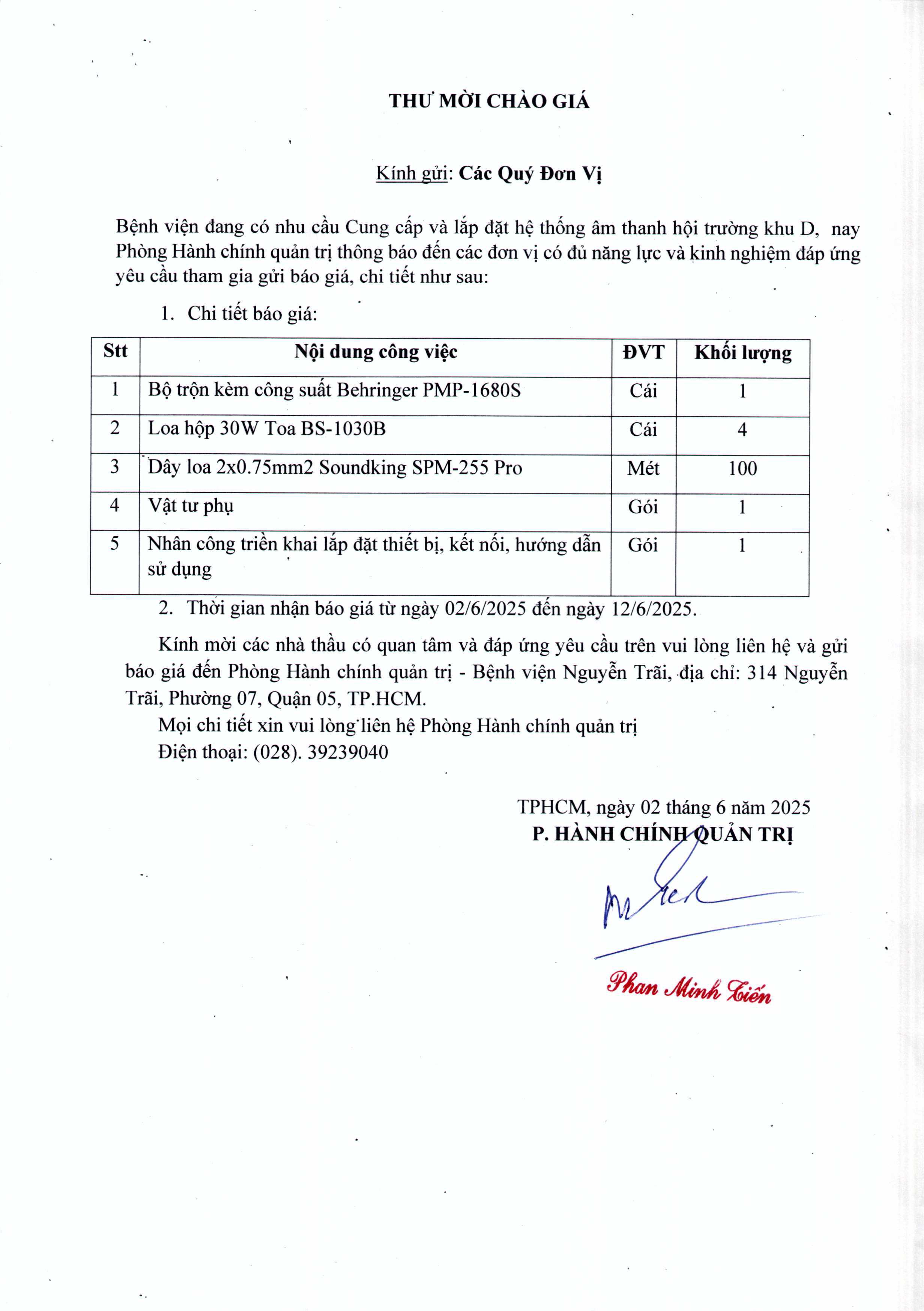 Thư mời chào giá Cung cấp và lắp đặt hệ thống ấm thanh hội trường khu D