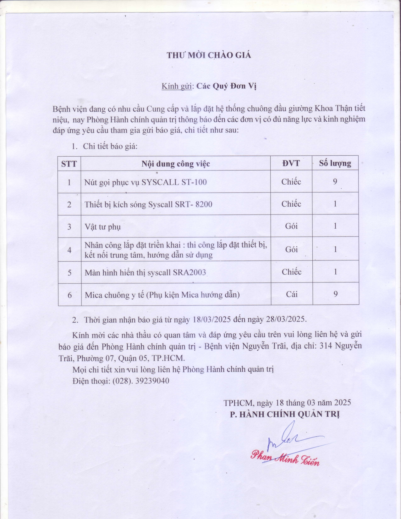 Thư mời chào giá Cung cấp và lắp đặt hệ thống chuông đầu giường khoa Thận tiết niệu