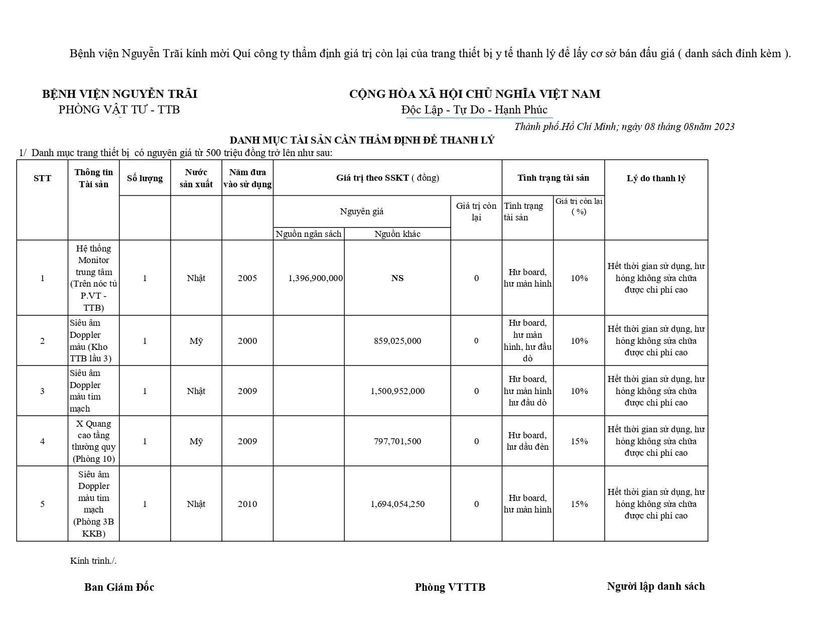 Thư mời chào giá danh mục tài sản trang thiết bị cần thẩm định để thanh lý có nguyên giá từ 500 triệu đồng