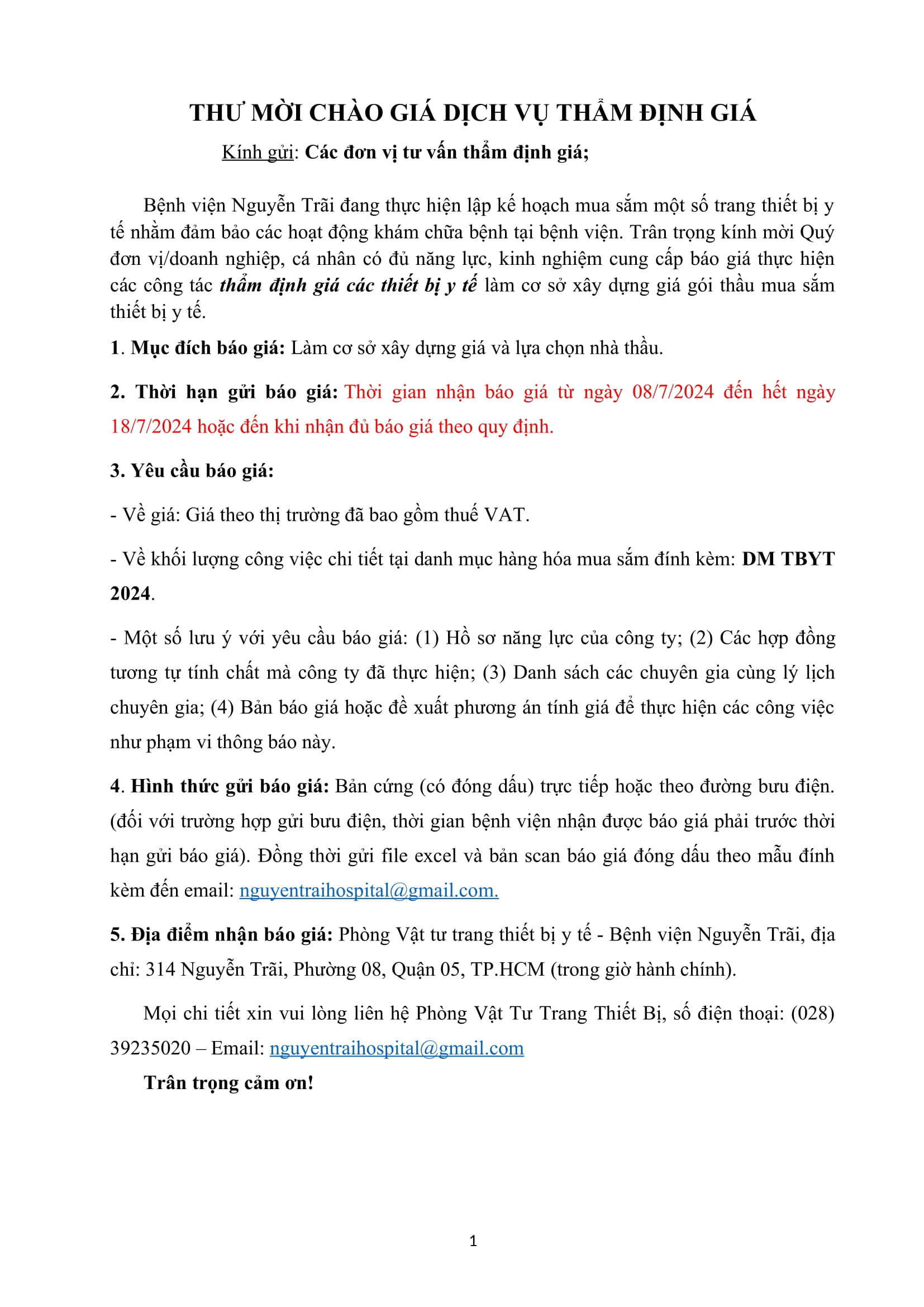 Thư mời chào giá dịch vụ thẩm định giá thiết bị y tế năm 2024