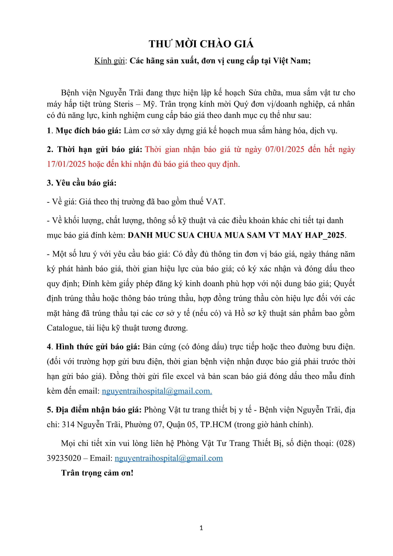 Thư mời chào giá gói thầu Sửa chữa, mua sắm vật tư cho máy hấp tiệt trùng Steris – Mỹ
