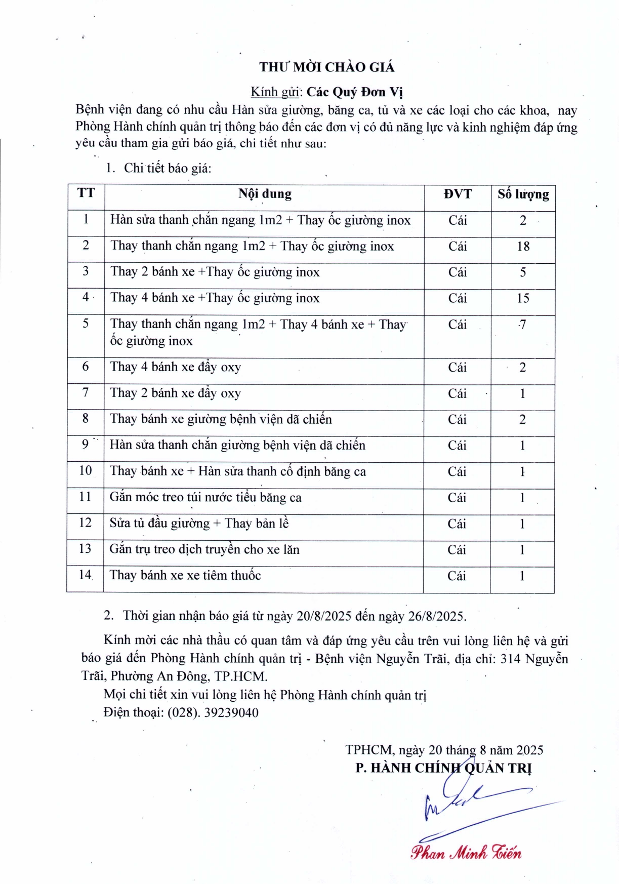 Thư mời chào giá Hàn sửa giường, băng ca, tủ và xe các loại cho các khoa