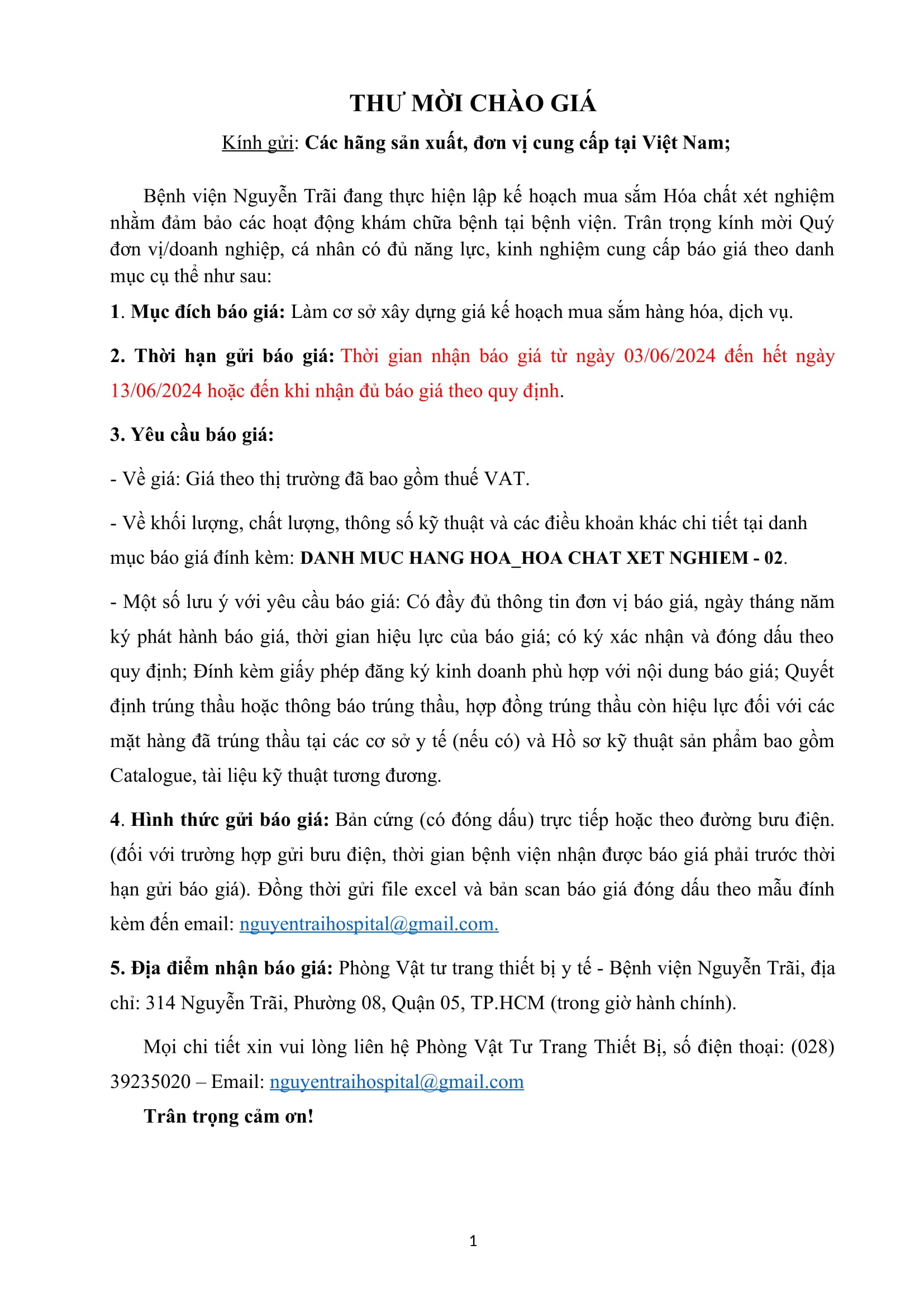 Thư mời chào giá hóa chất, dung dịch dùng trong xét nghiệm của Bệnh viện Nguyễn Trãi