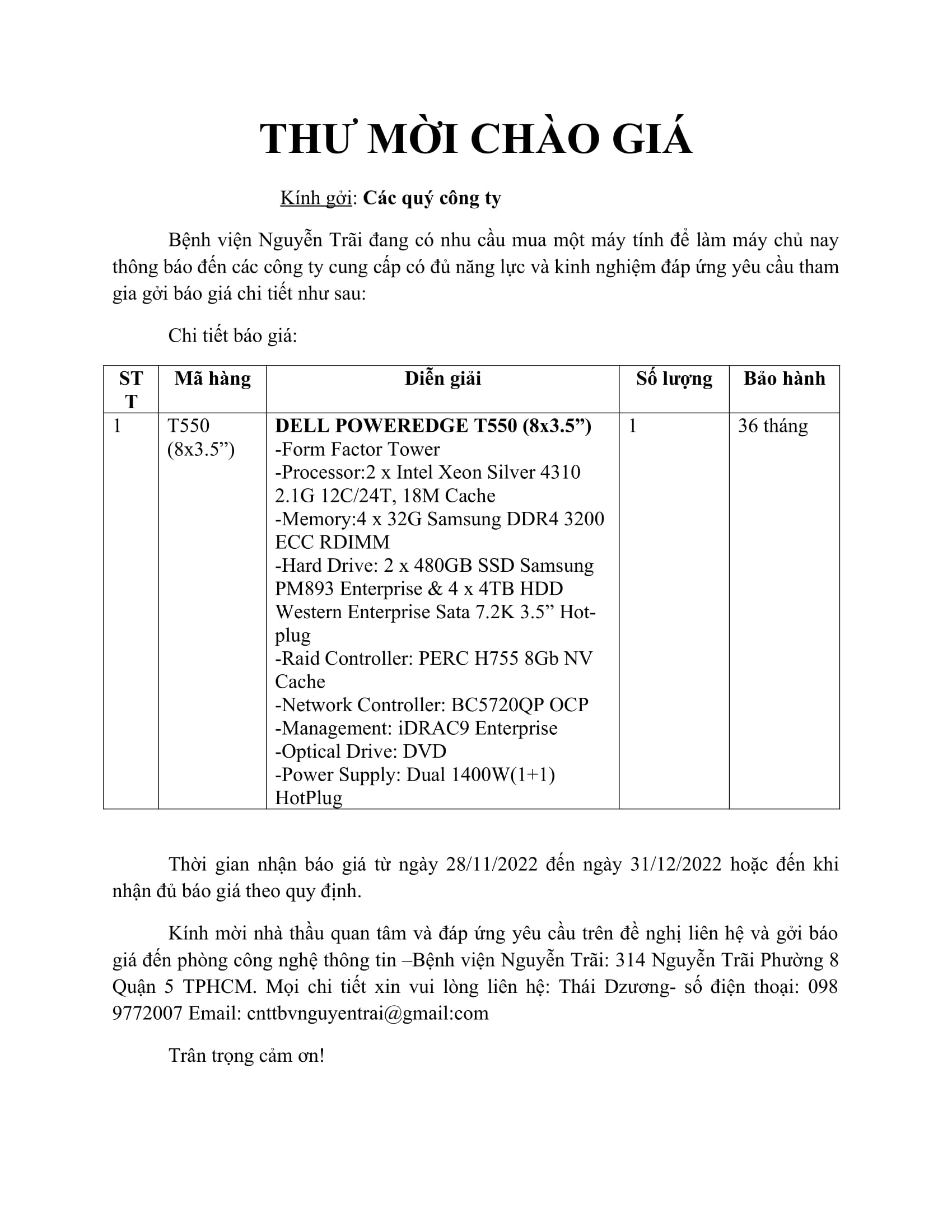 Thư mời chào giá mua máy tính để làm máy chủ