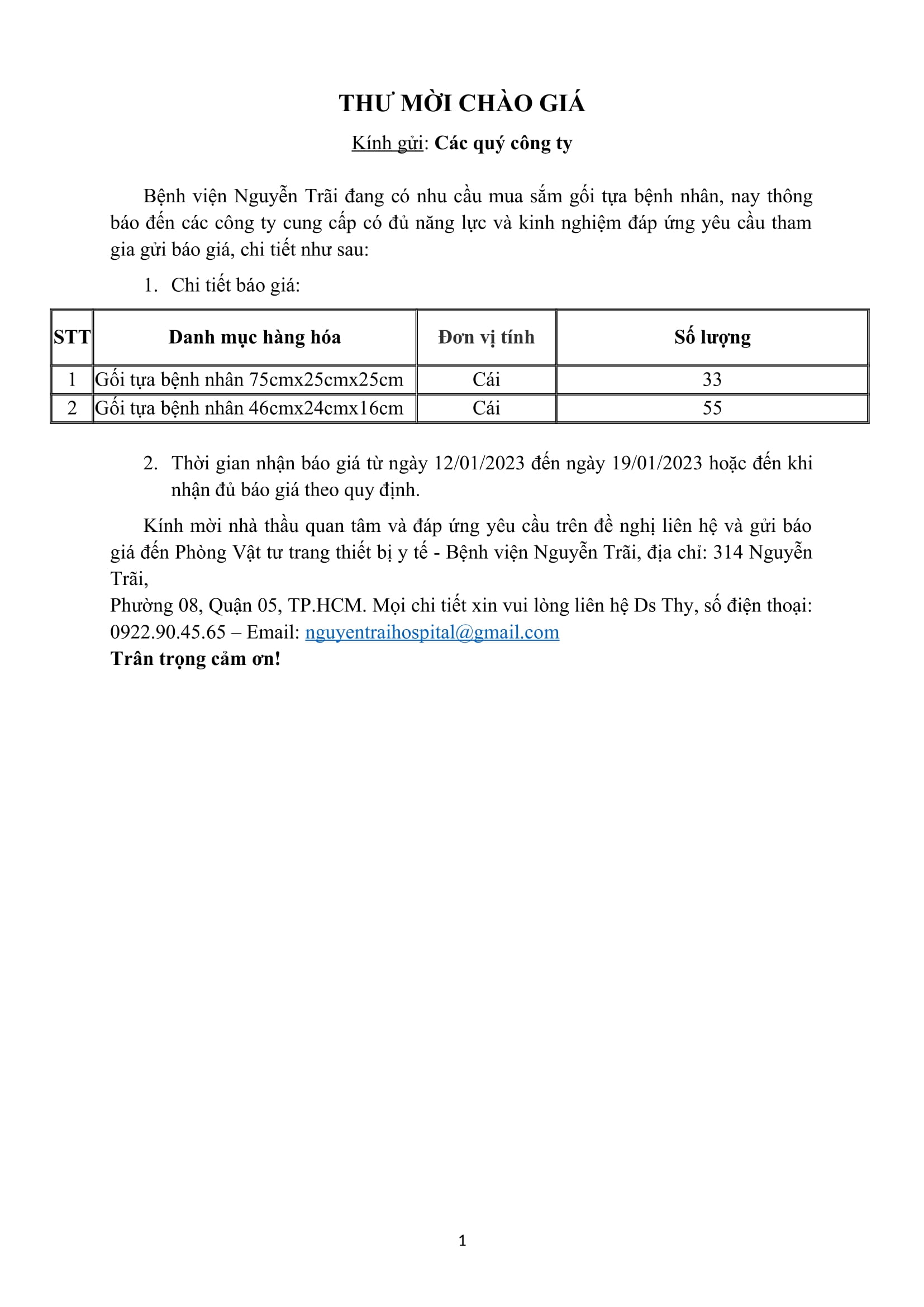 Thư mời chào giá mua sắm gối tựa bệnh nhân