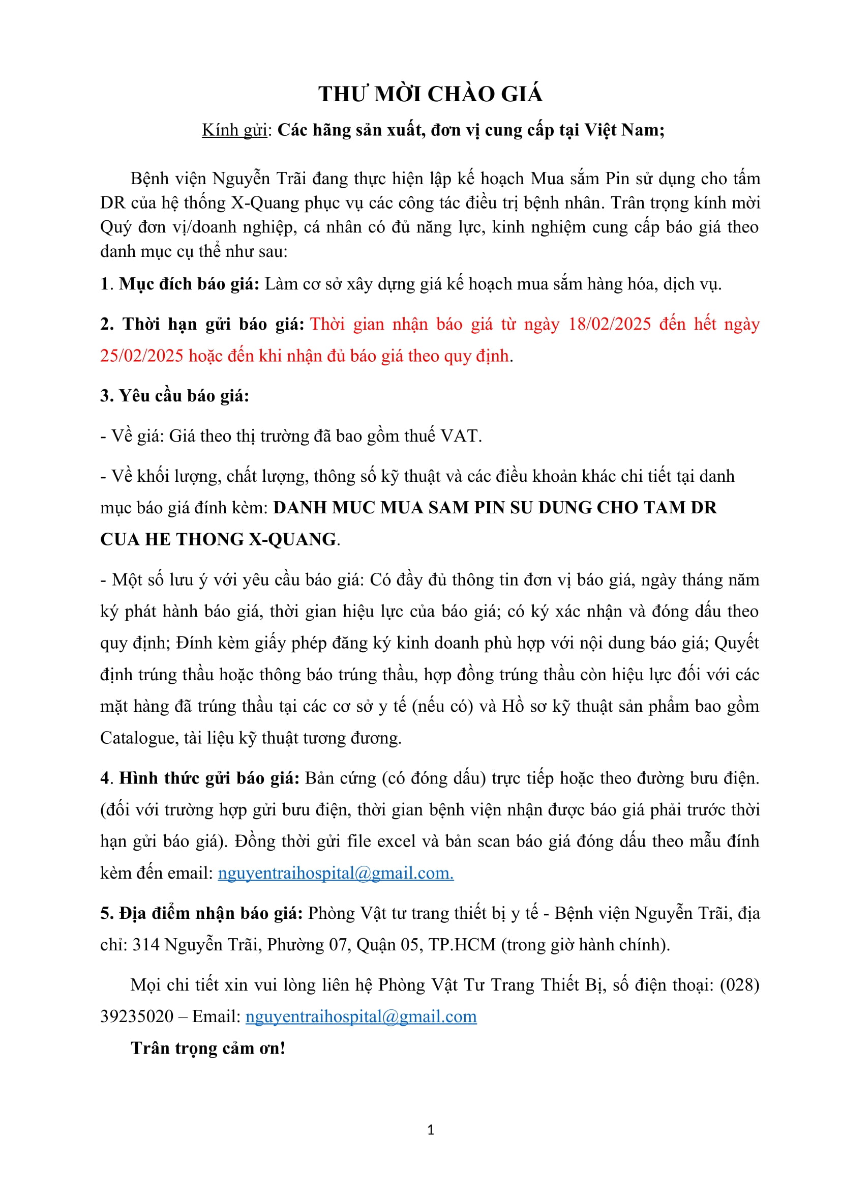 Thư mời chào giá Mua sắm pin sử dụng cho tấm DR của hệ thống X-Quang phục vụ công tác điều trị bệnh nhân