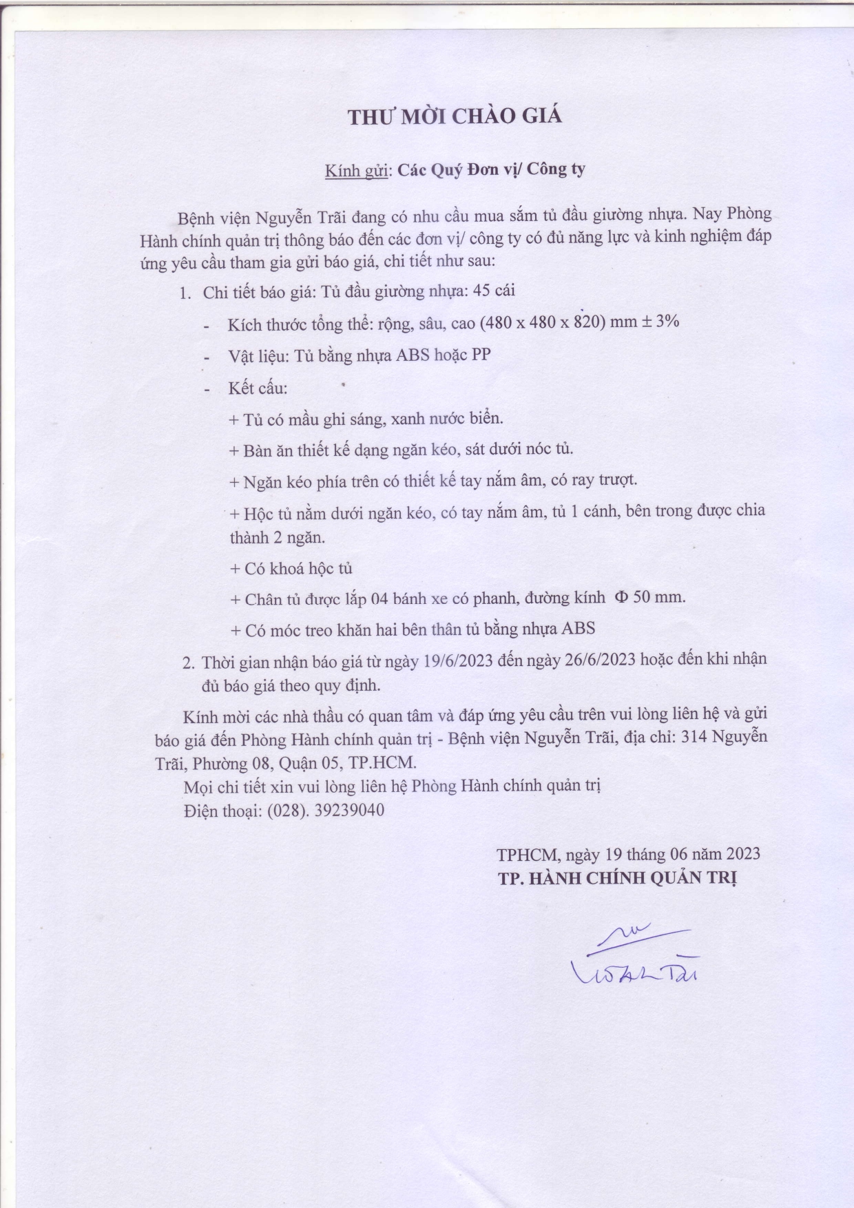 Thư mời chào giá mua sắm tủ đầu giường nhựa