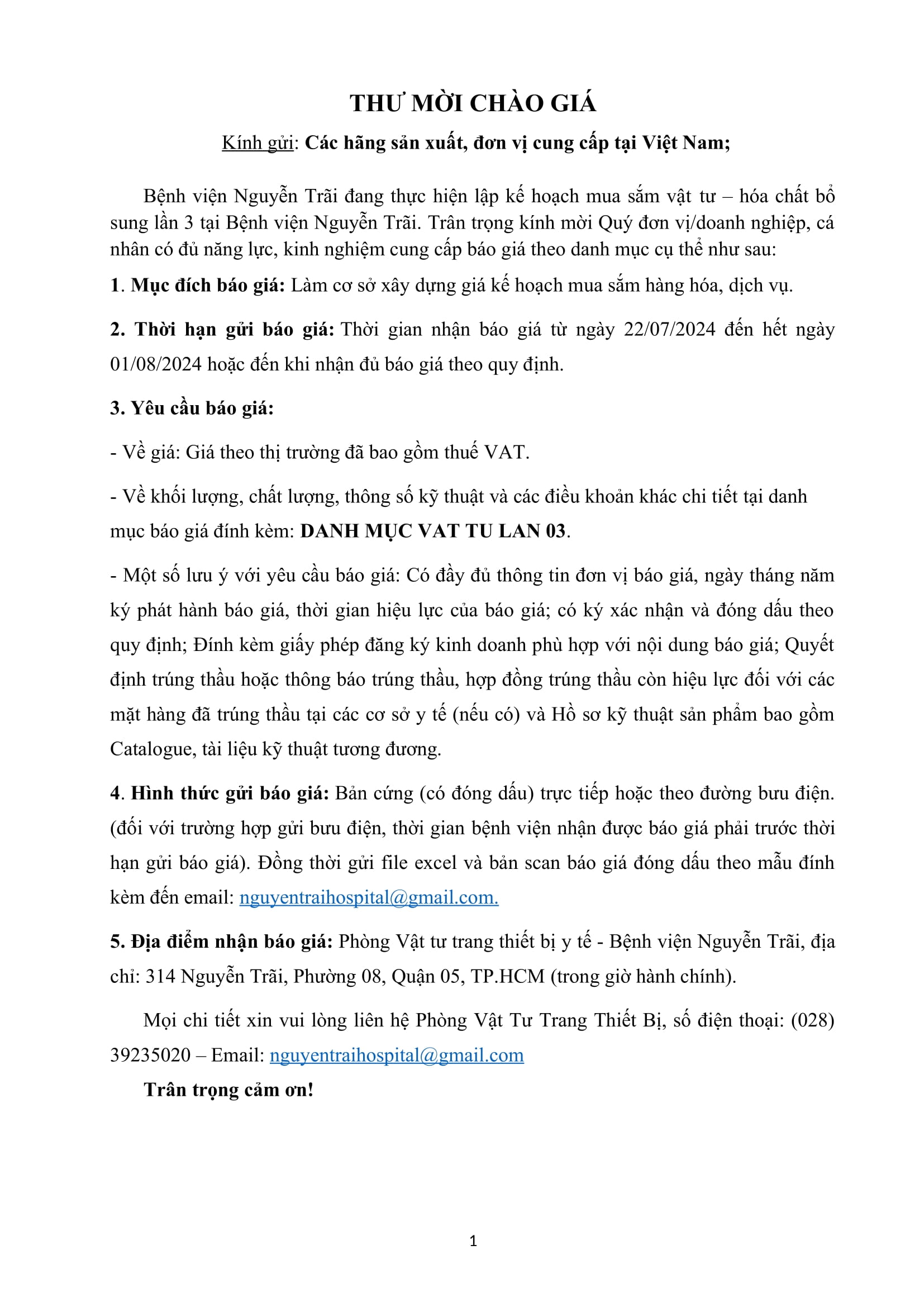 Thư mời chào giá mua sắm vật tư-hoá chất bổ sung lần 3