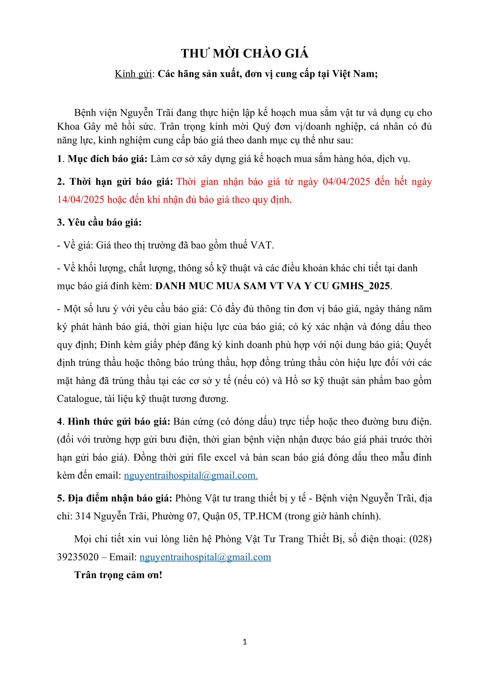 Thư mời chào giá mua sắm vật tư và dụng cụ cho khoa Gây mê hồi sức
