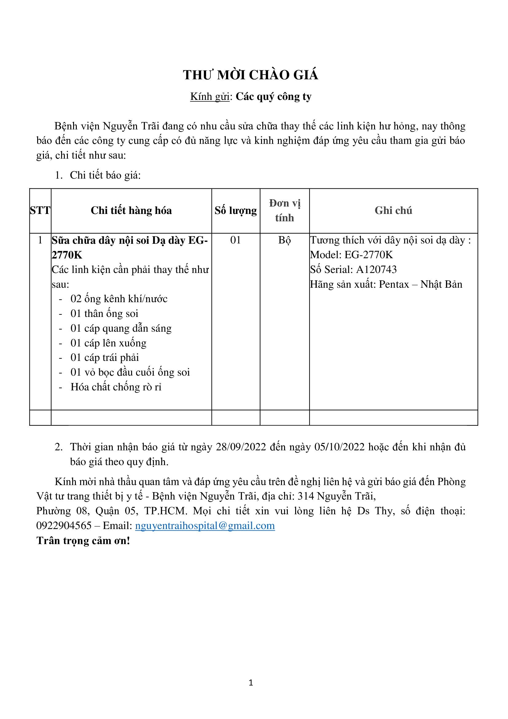Thư mời chào giá sữa chữa dây nội soi dạ dày EG 2770K