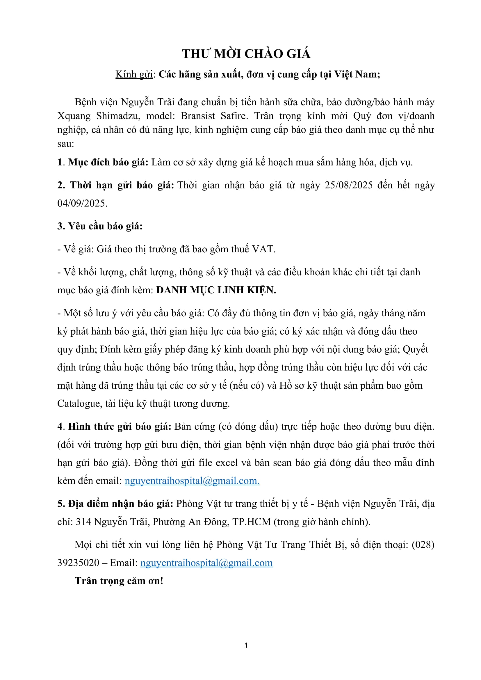 Thư mời chào giá sửa chữa máy xquang