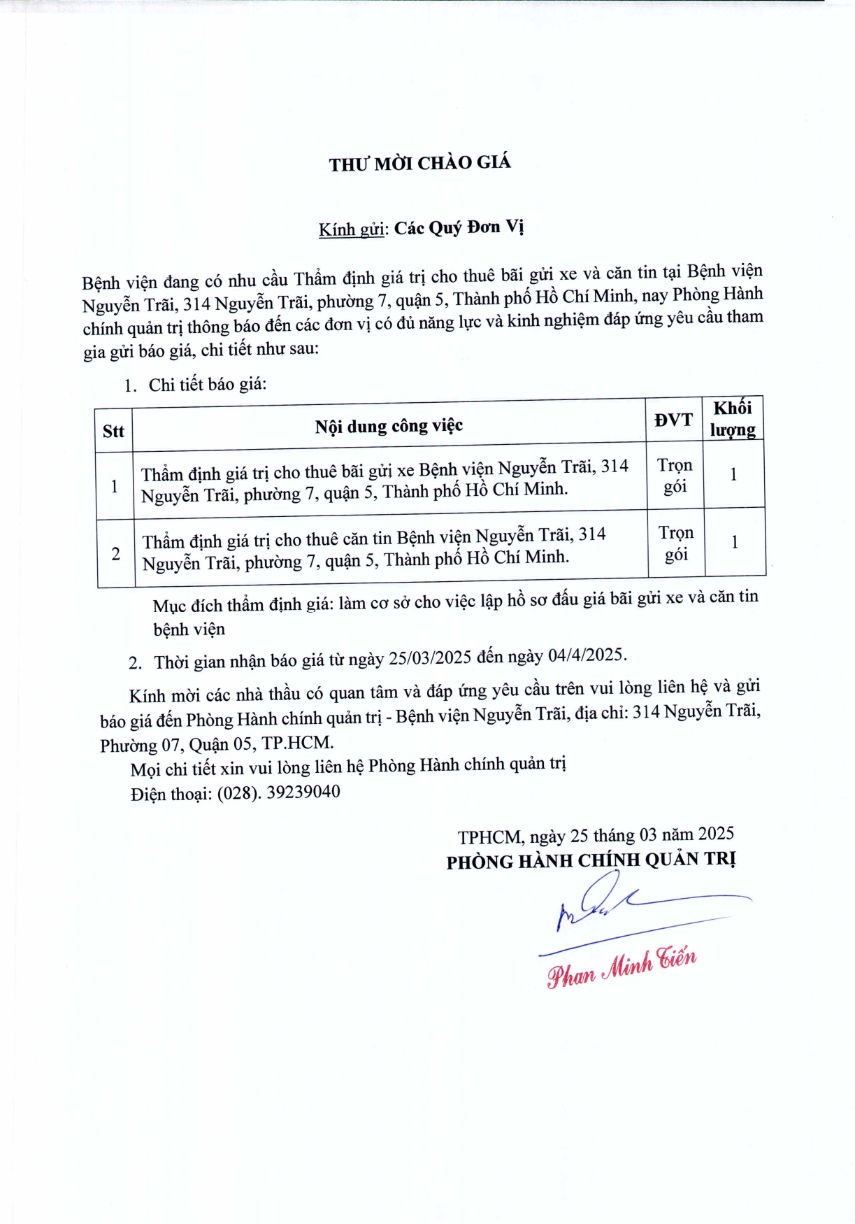 Thư mời chào giá Thẩm định giá trị cho thuê bãi gửi xe tại Bệnh viện Nguyễn Trãi,314 Nguyễn Trãi, phường 7 Quận 5