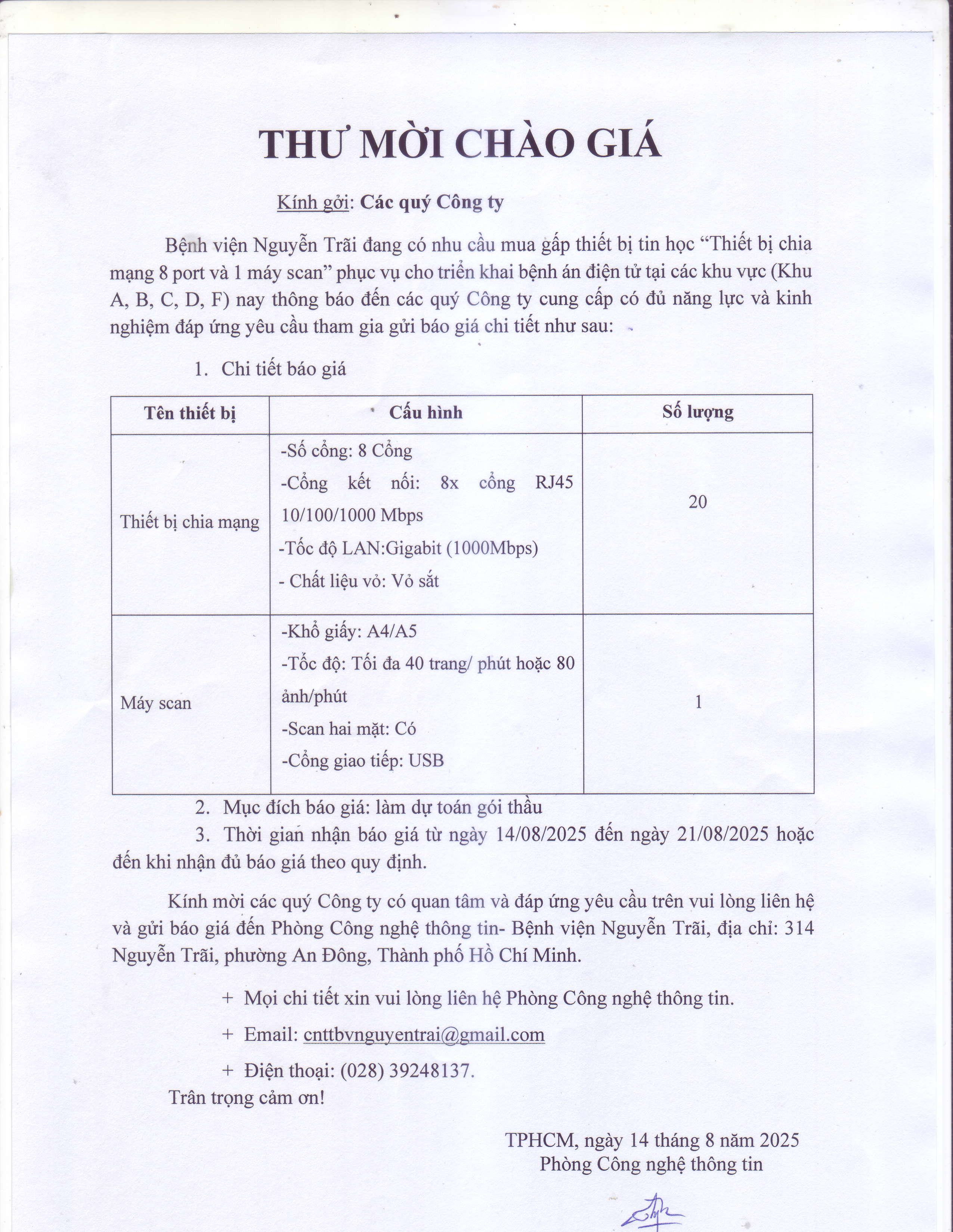 Thư mời chào giá “thiết bị chia mạng 8 port và 1 máy scan” phục vụ cho triển khai bệnh án điện tử