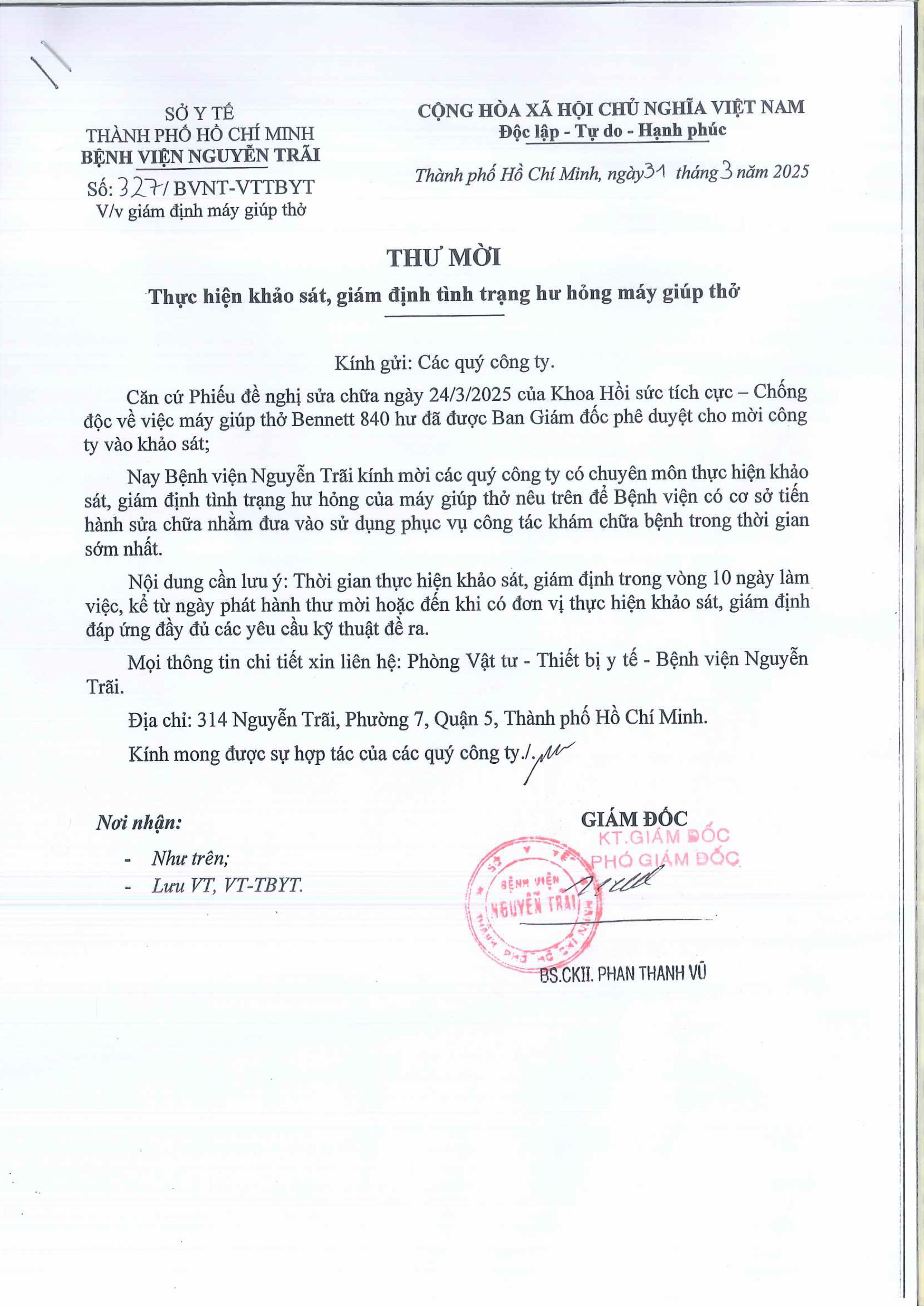 Thư mời chào giá thực hiện khảo sát, giám định tình trạng hư hỏng máy giúp thở
