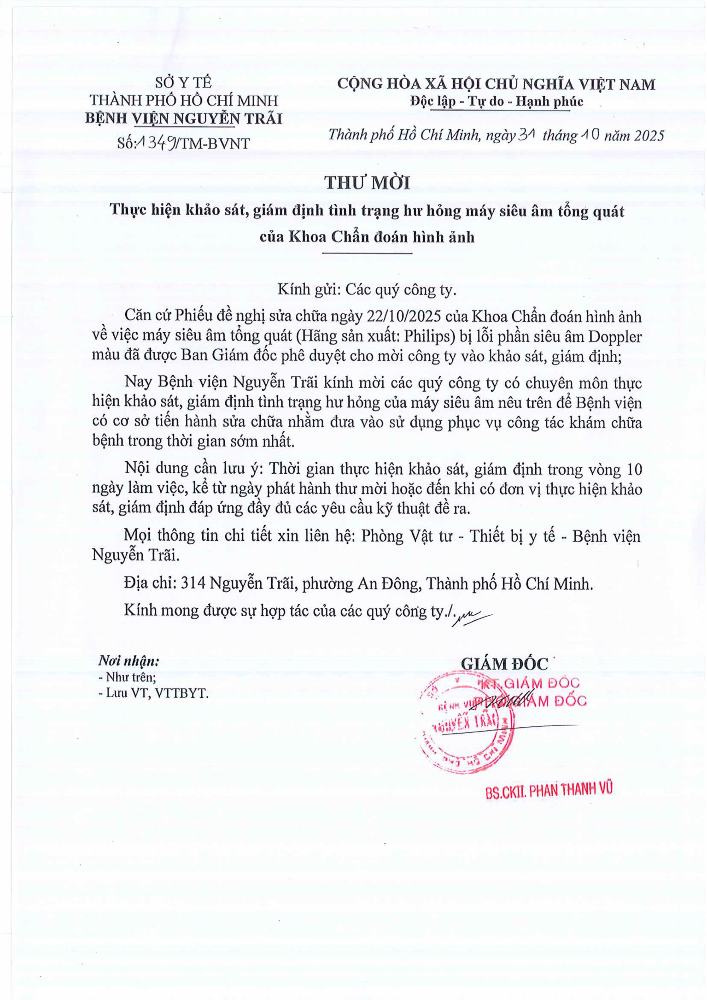 Thư mời chào giá thực hiện khảo sát, giám định tình trạng hư hỏng máy siêu âm tổng quát của khoa Chẩn đoán hình ảnh