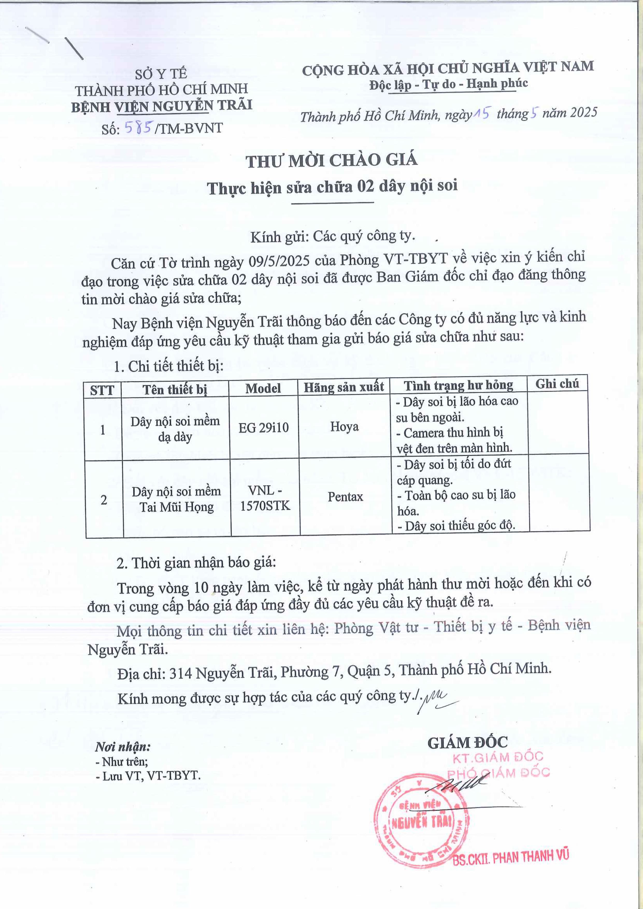 Invitation to submit bids for the repair of two endoscope cables.