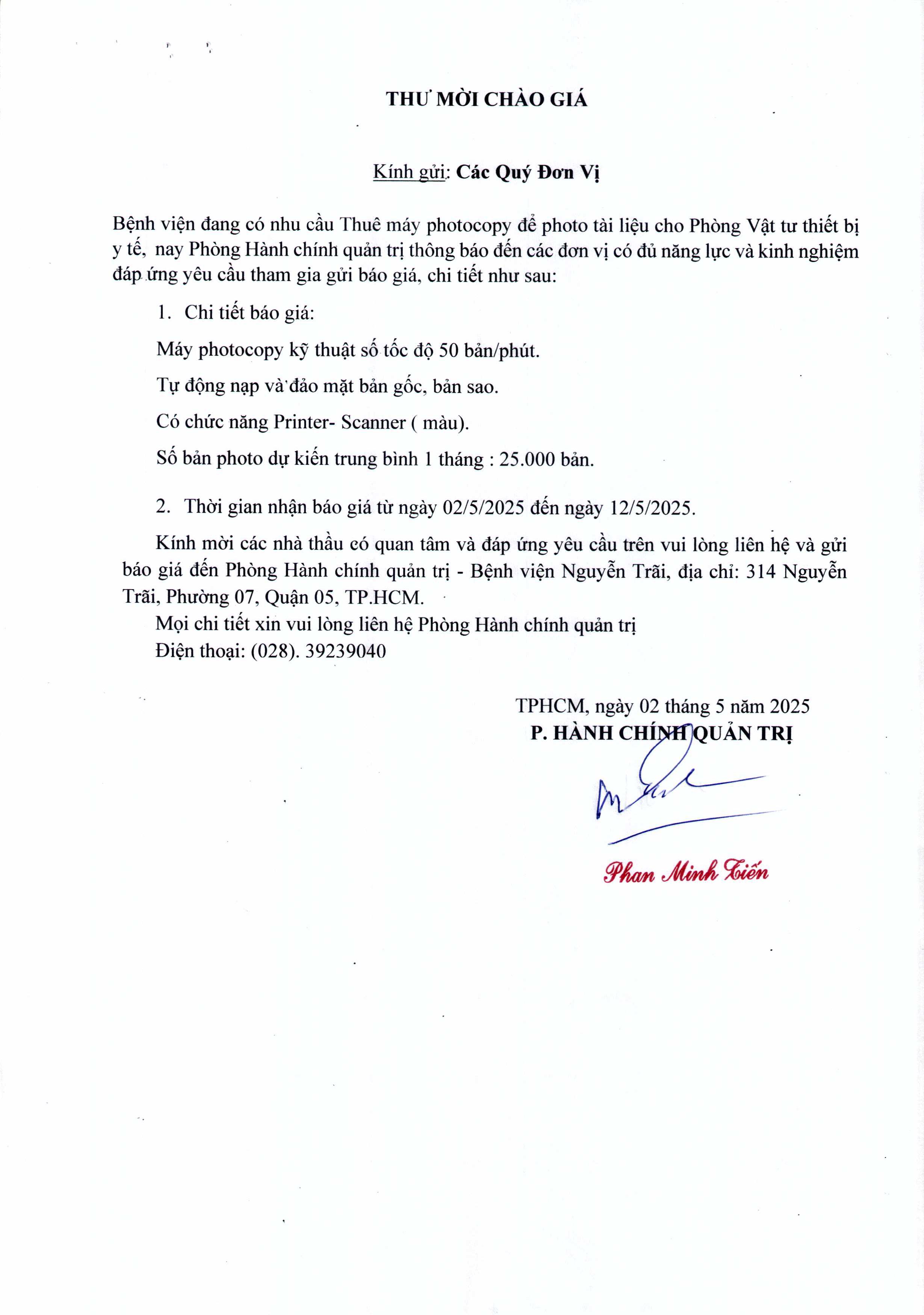 Invitation to submit bids for renting a photocopier to photocopy documents for the medical equipment and supplies department.