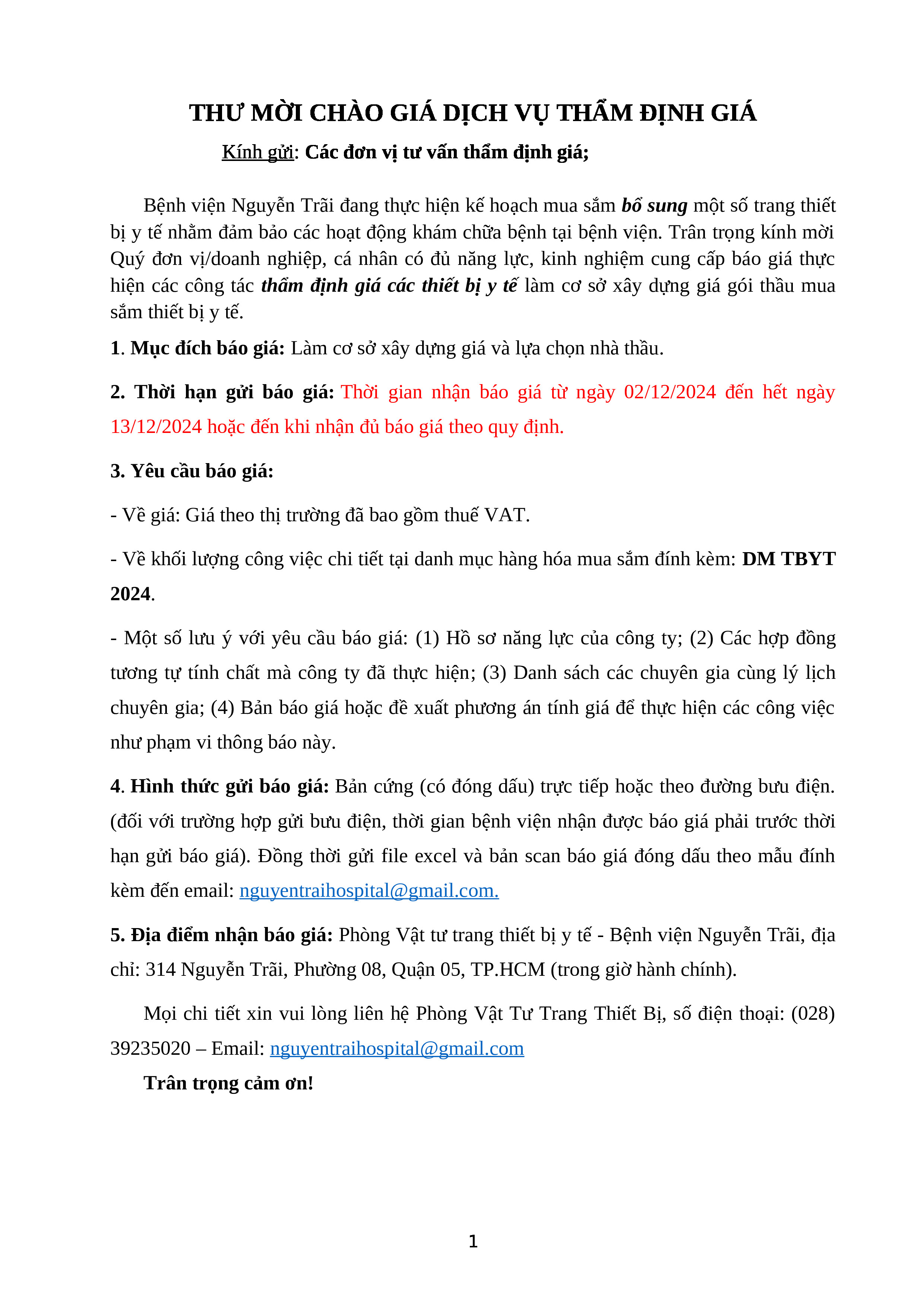Thư mới chào giá tư vấn thẩm định giá thiết bị y tế – mua sắm bổ sung thiết bị y tế