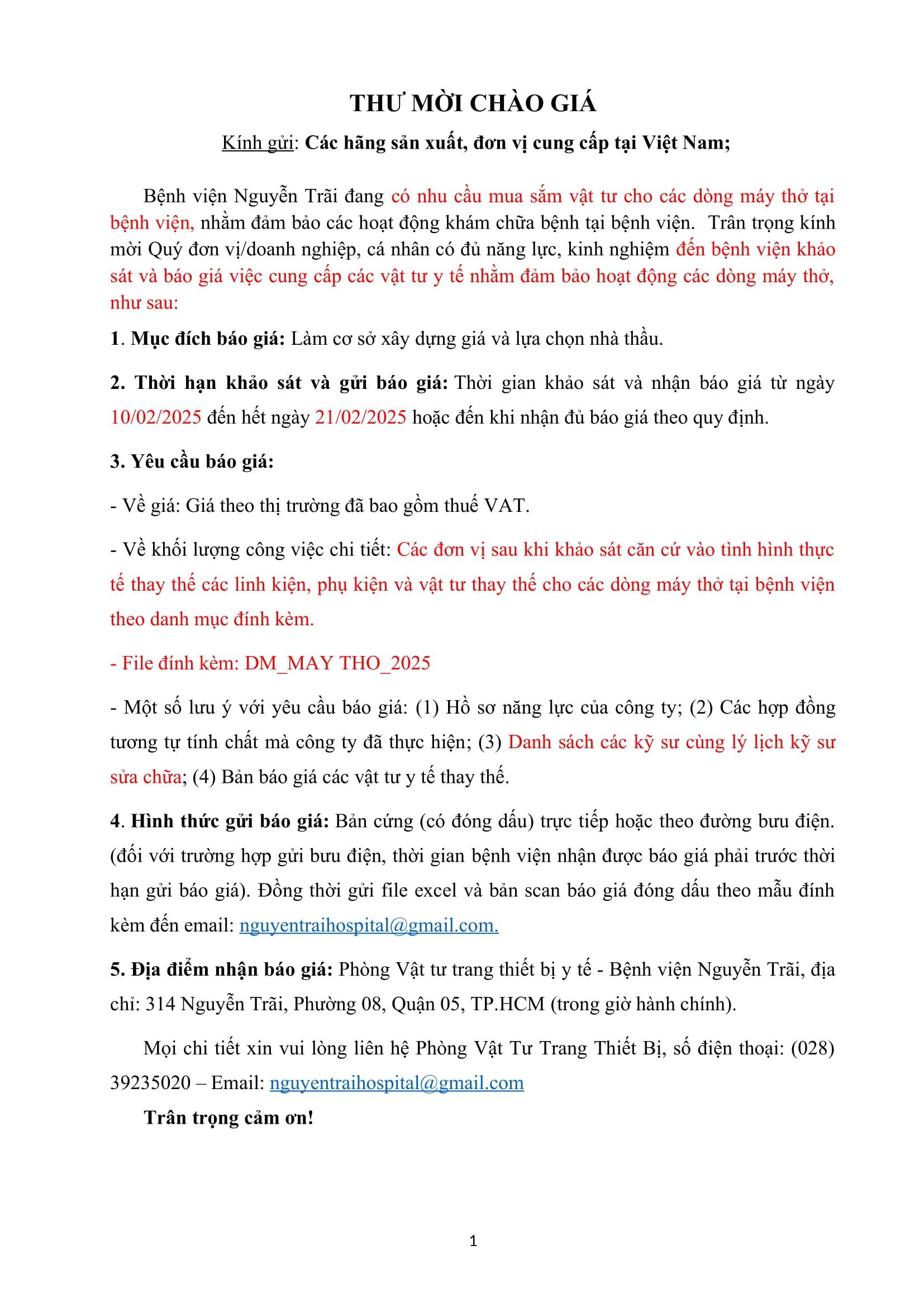 Thư mời khảo sát và chào giá vật tư các dòng máy thở năm 2025