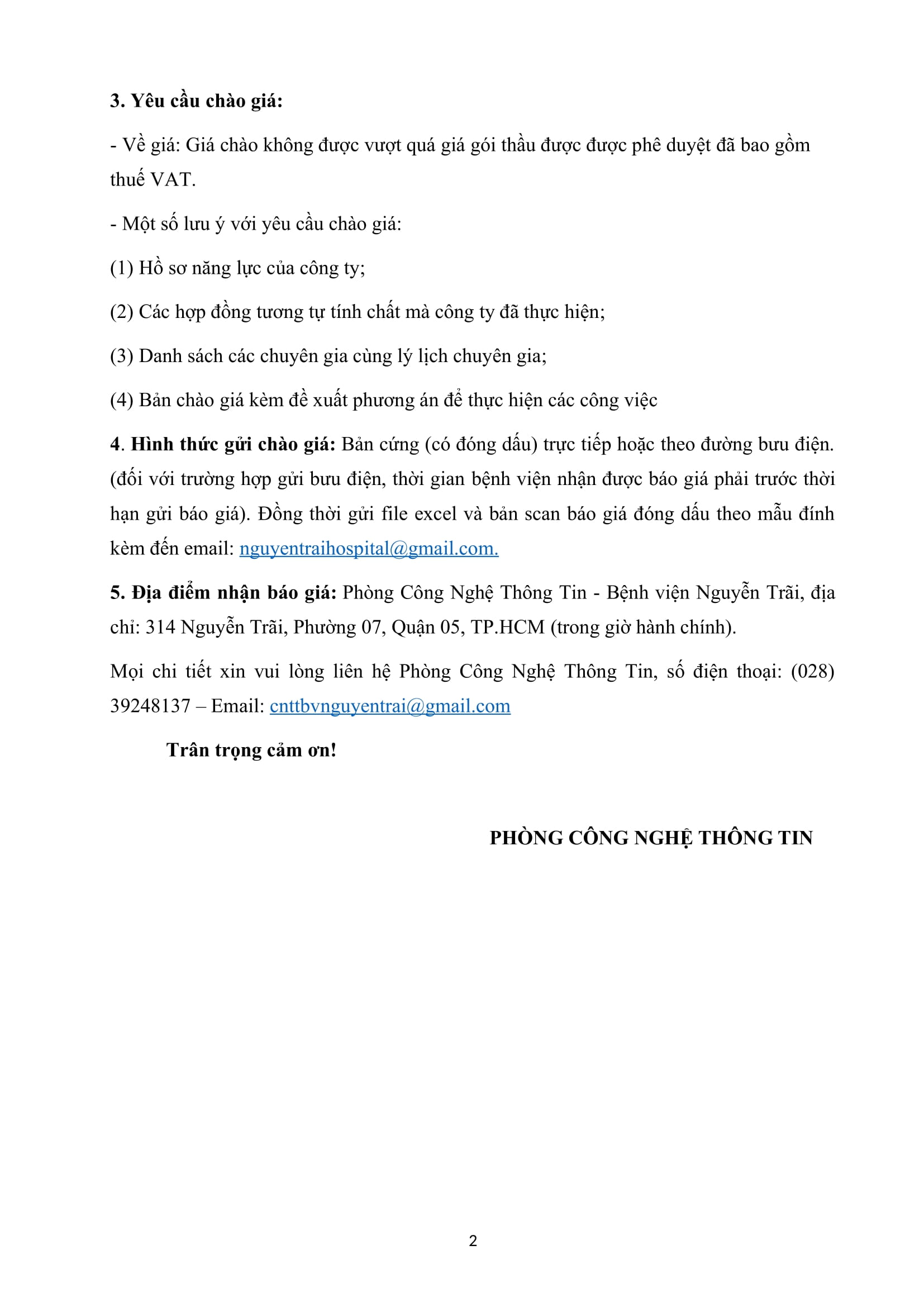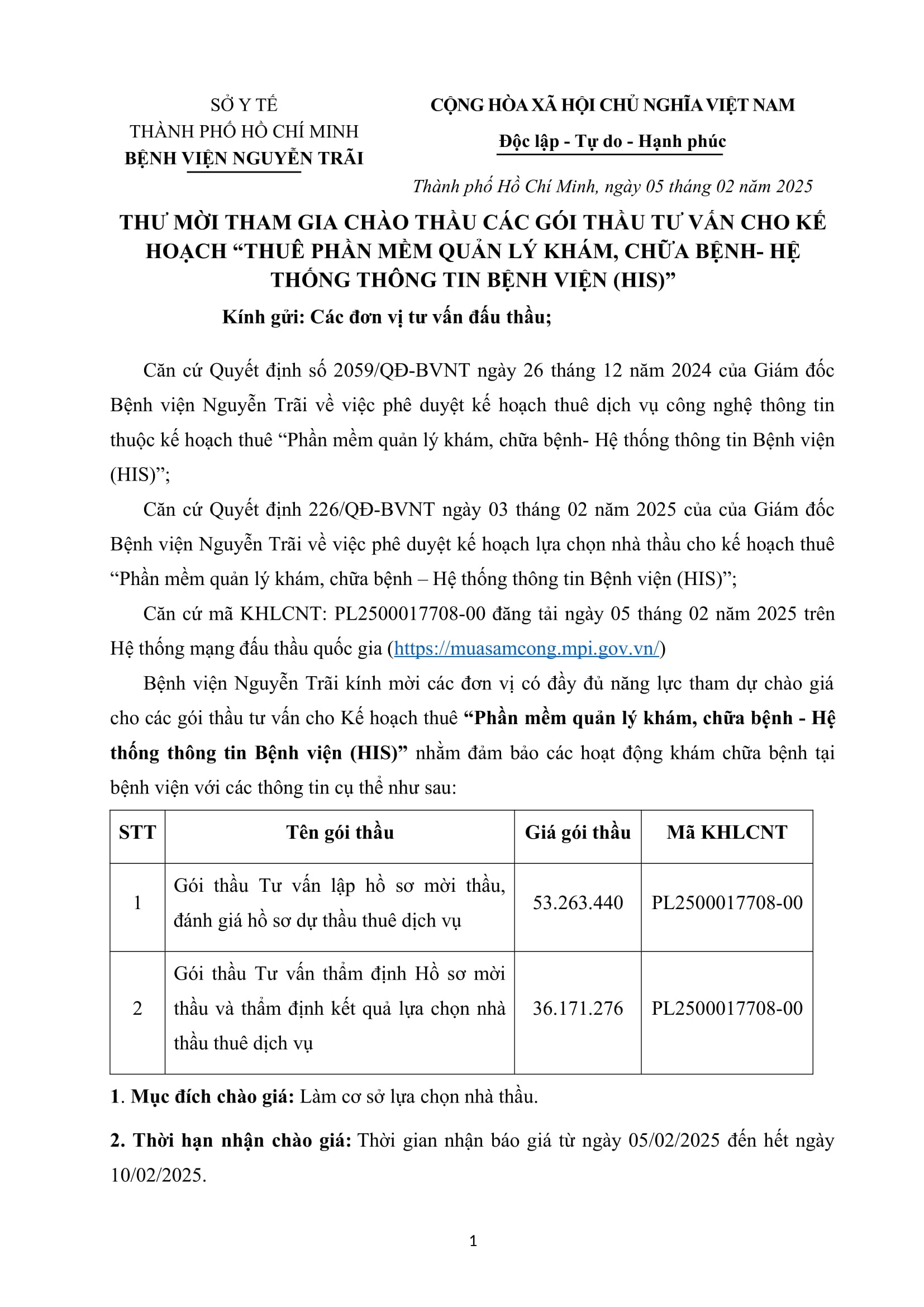 Thư mời tham gia chào thầu các gói thầu tư vấn cho kế hoạch “Thuê phần mềm quản lý khám, chữa bệnh – Hệ thống thông tin bệnh viện (HIS) “