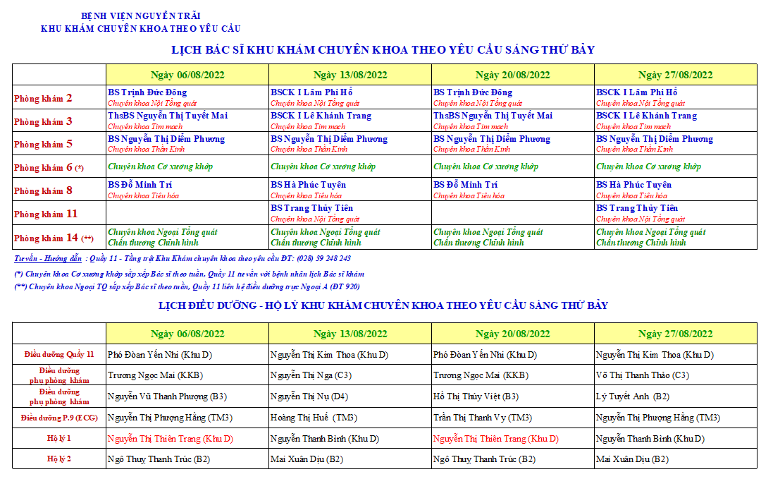 Lịch Khám Dịch Vụ Thứ Bảy-Tháng 8-2022