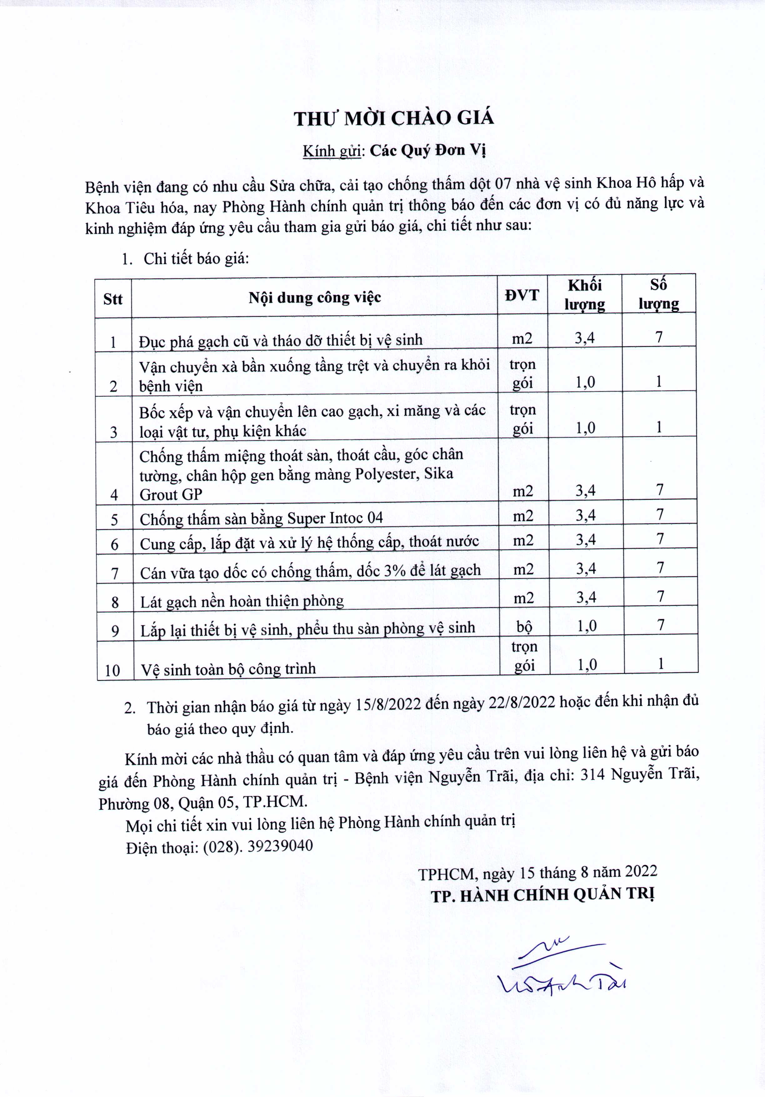 Thư mời chào giá Bệnh viện đang có nhu cầu sửa chữa, cải tạo chống thấm dột 07 nhà vệ sinh Khoa Hô hấp và Khoa Tiêu hóa