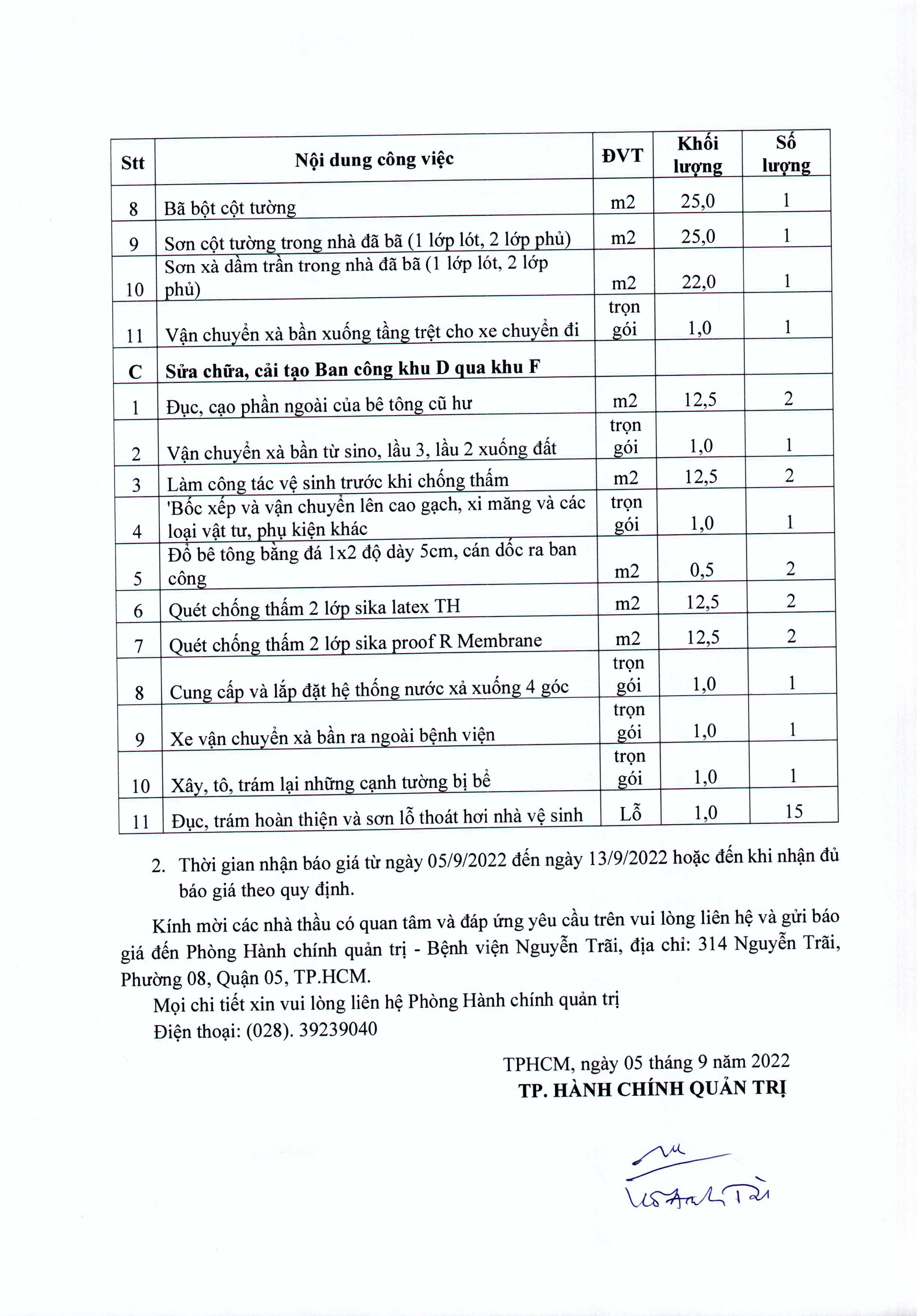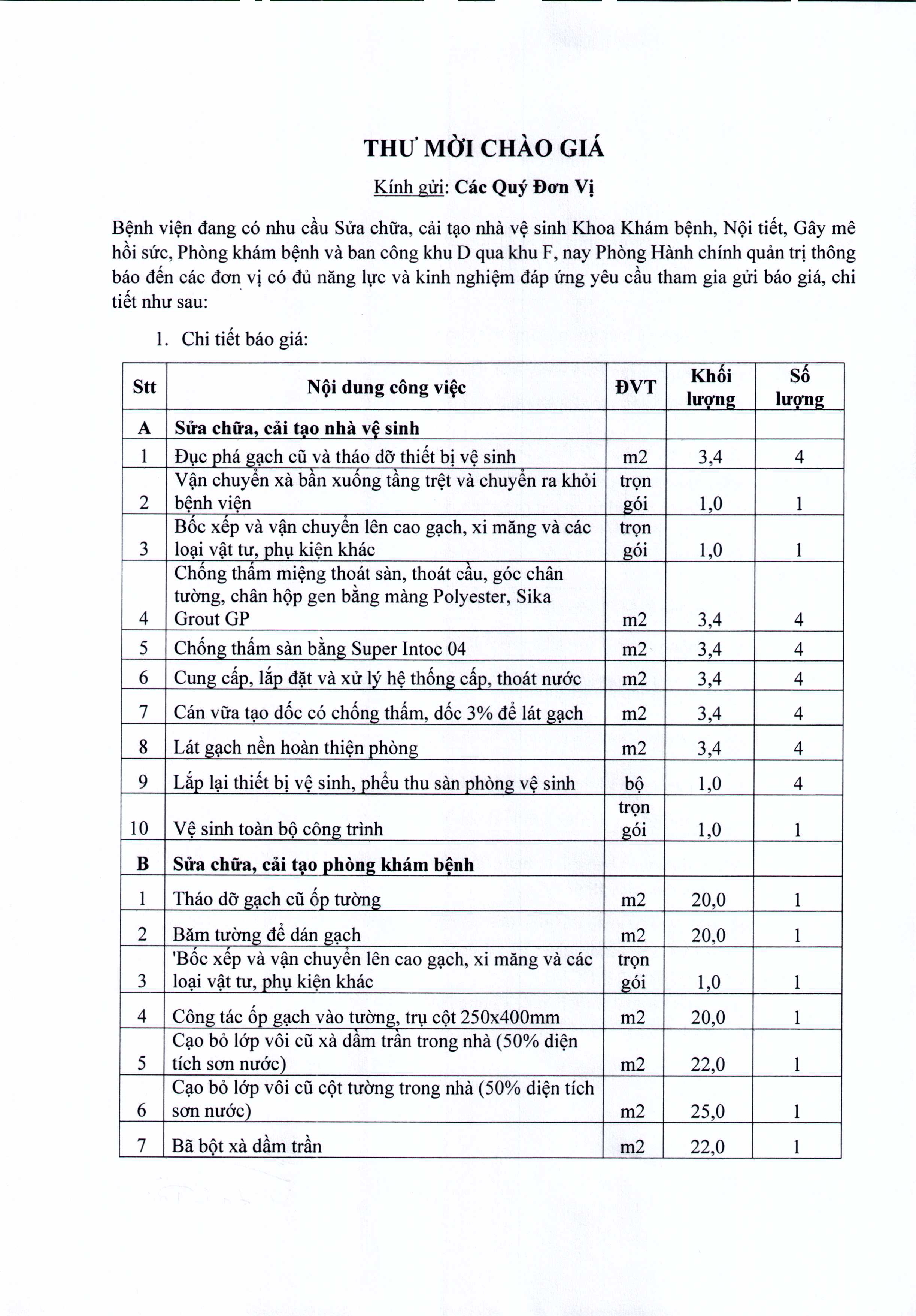 Thư mời chào giá Bệnh viện đang có nhu cầu sửa chữa, cải tạo nhà vệ sinh Khoa Khám bệnh, Nội tiết, Gây mê hồi sức, Phòng khám bệnh và ban công khu D qua khu F