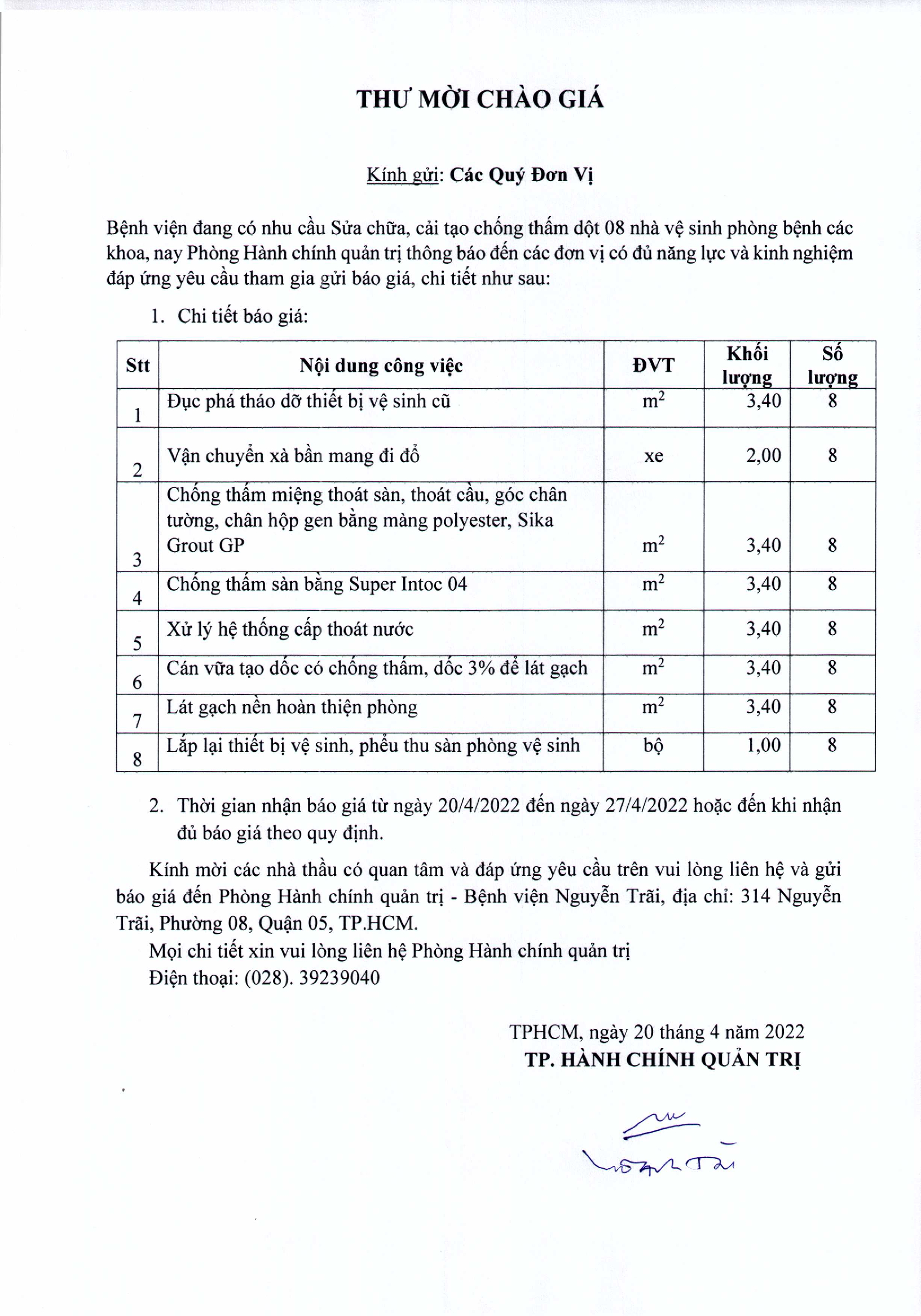 Thư mời chào giá Bệnh viện đang có nhu cầu sửa chữa,cải tạo chống thấm dột 08 nhà vệ sinh phòng bệnh các khoa