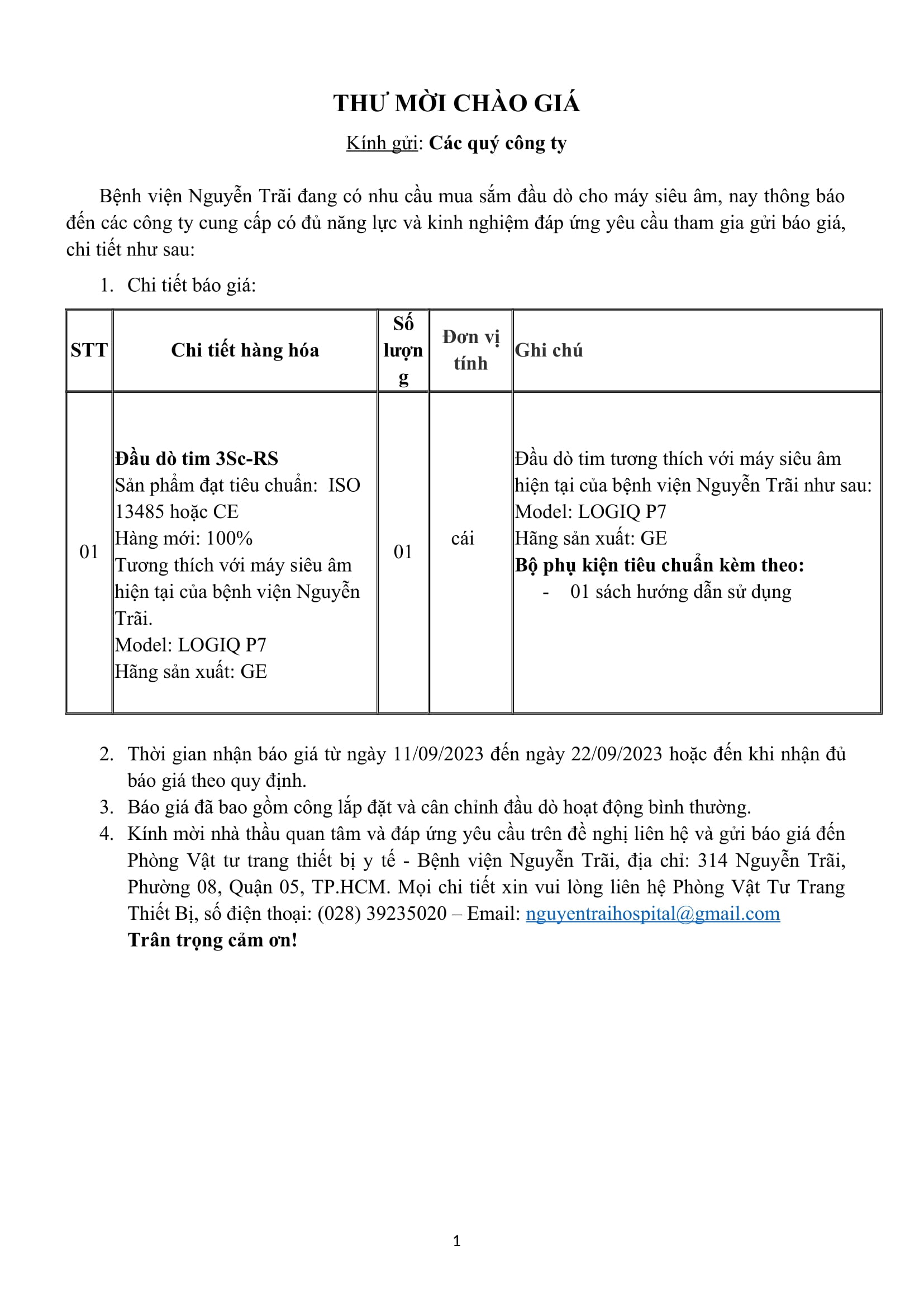 Thư mời chào giá bệnh viện Nguyễn Trãi có nhu cầu mua sắm đầu dò tim 3Sc-RS cho máy siêu âm