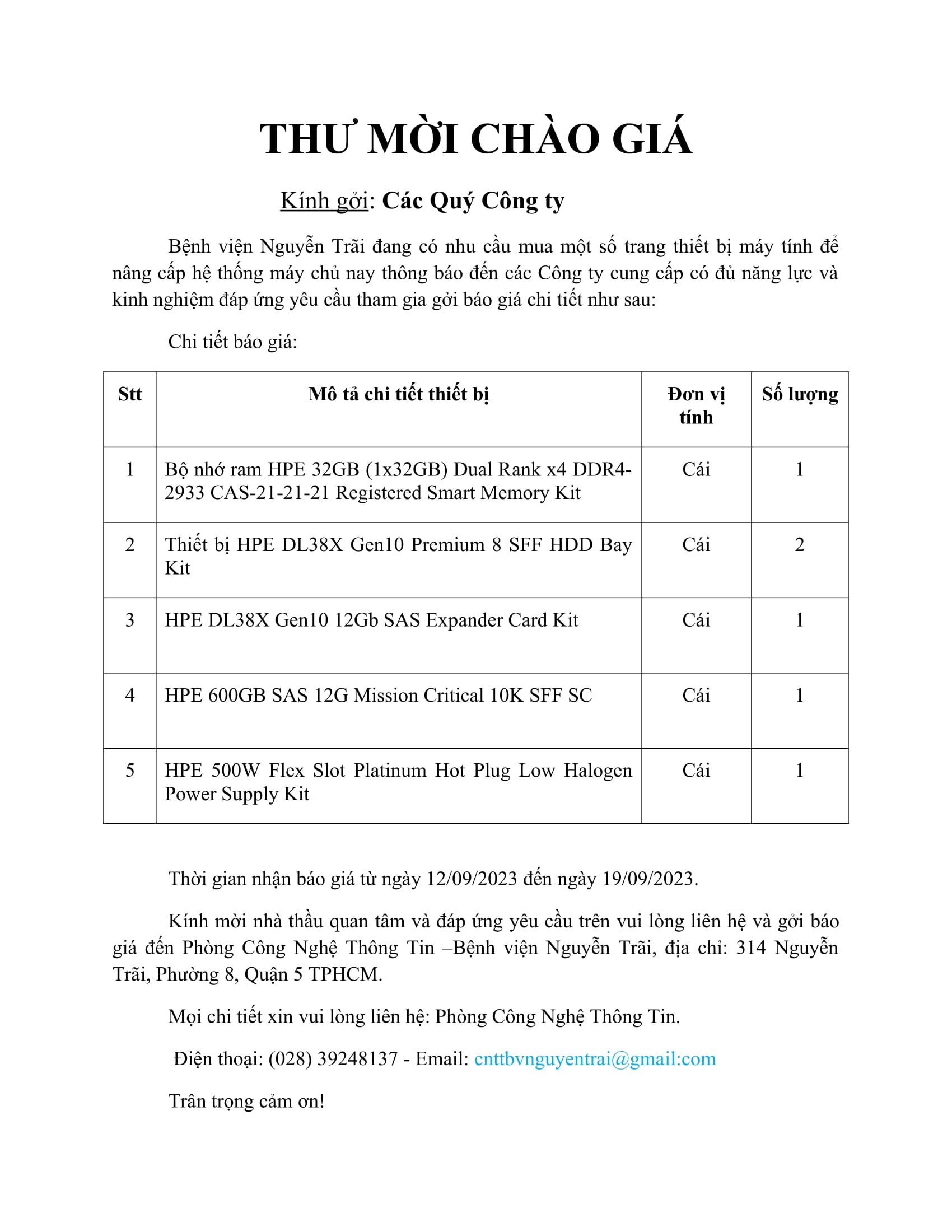Thư mời chào giá bệnh viện Nguyễn Trãi đang có nhu cầu mua một số trang thiết bị máy tính để nâng cấp hệ thống máy chủ.