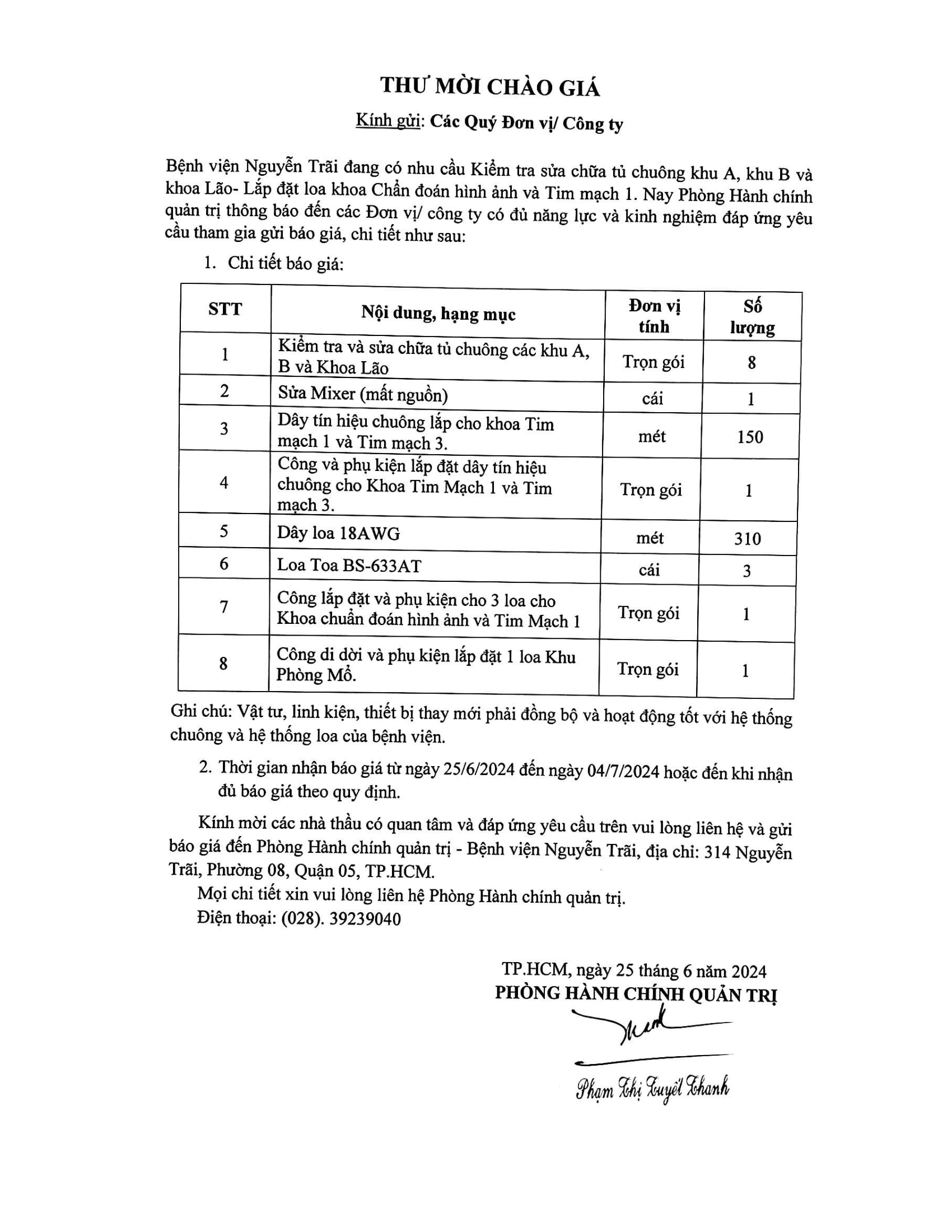 Thư mời chào giá kiểm tra, sửa chữa tủ chuông khu A, khu B và khoa Lão, lắp đặt loa khoa Chẩn đoán hình ảnh và Tim mạch 1