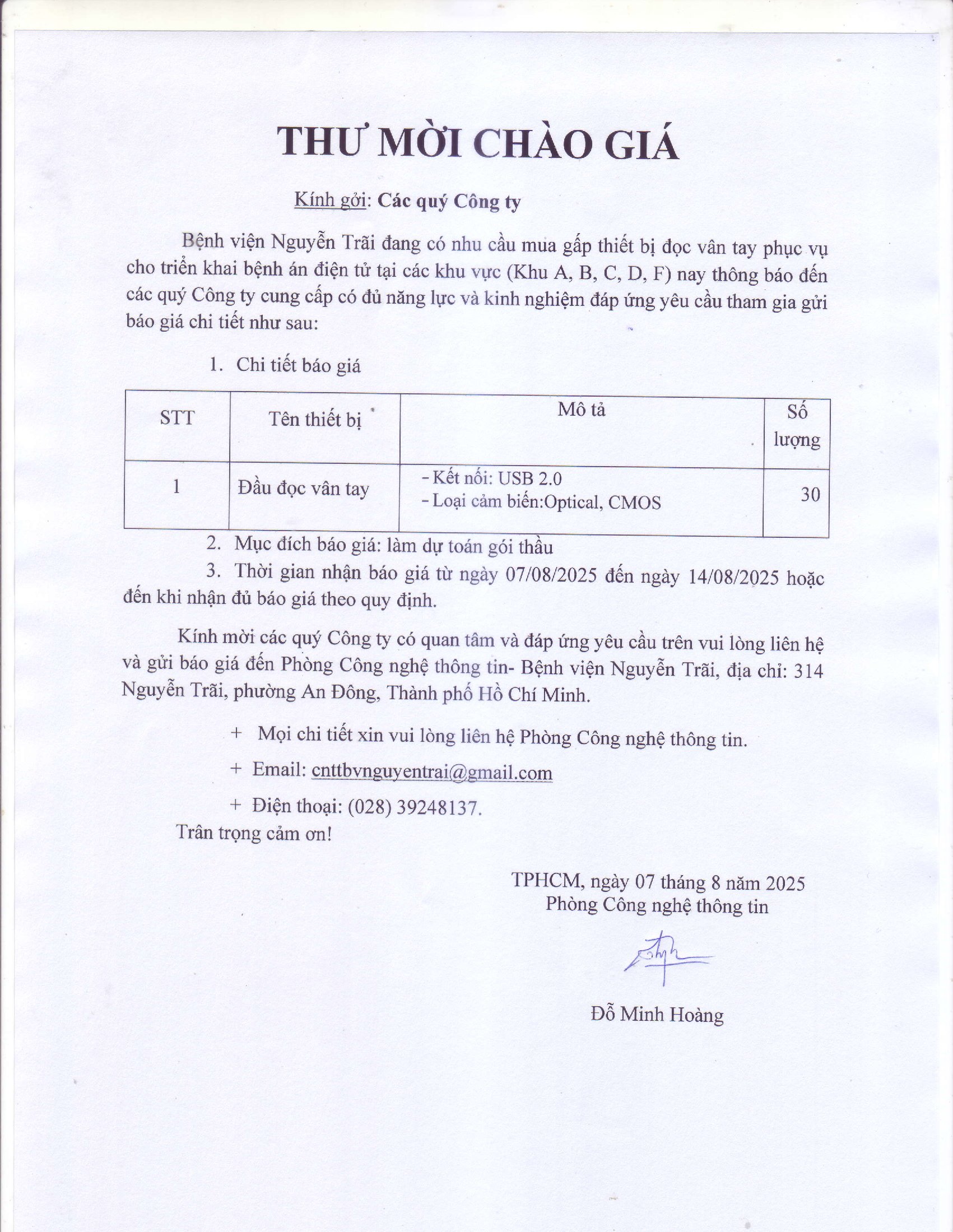 Thư mời chào giá mua gấp thiết bị đọc vân tay phục vụ cho triển khai bệnh án điện tử tại các khu vực (khu A,B,C,D,F)