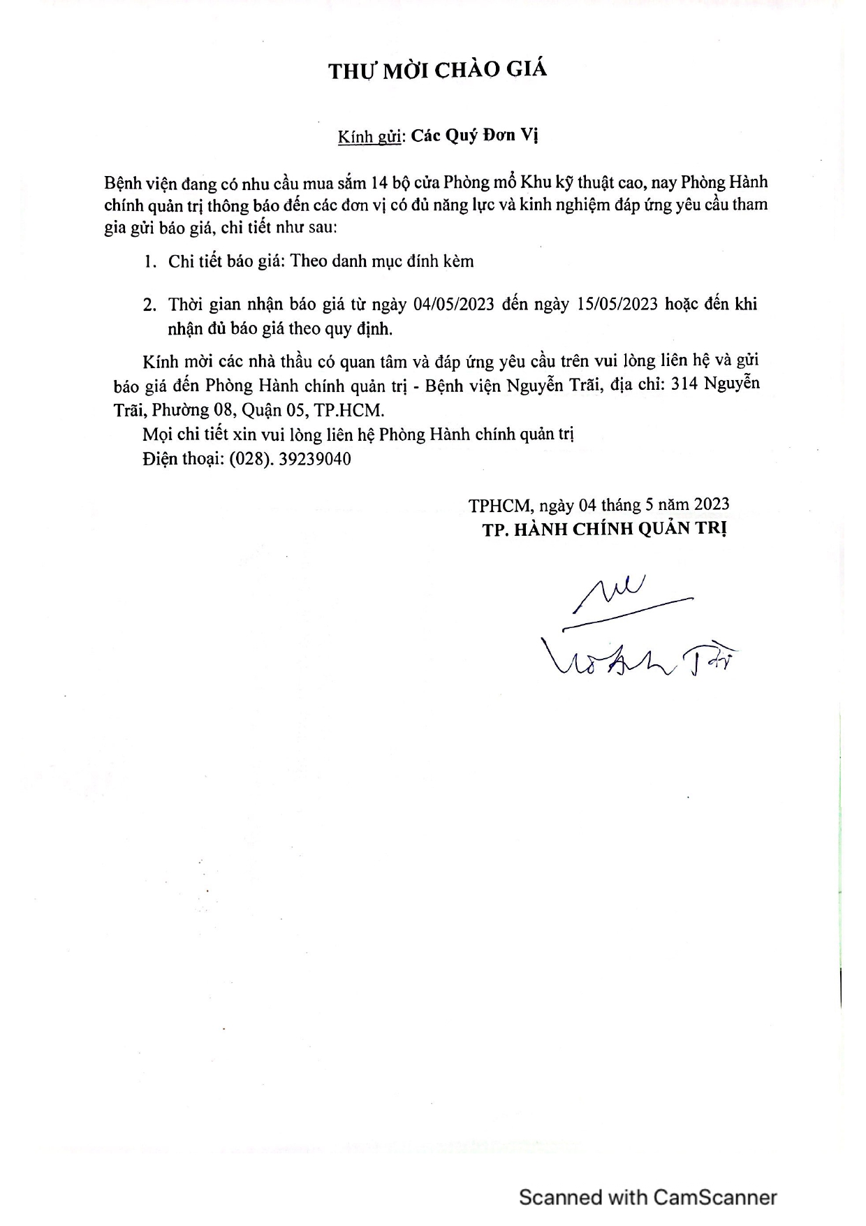 Thư mời chào giá mua sắm 14 bộ cửa phòng mổ khu kỹ thuật cao