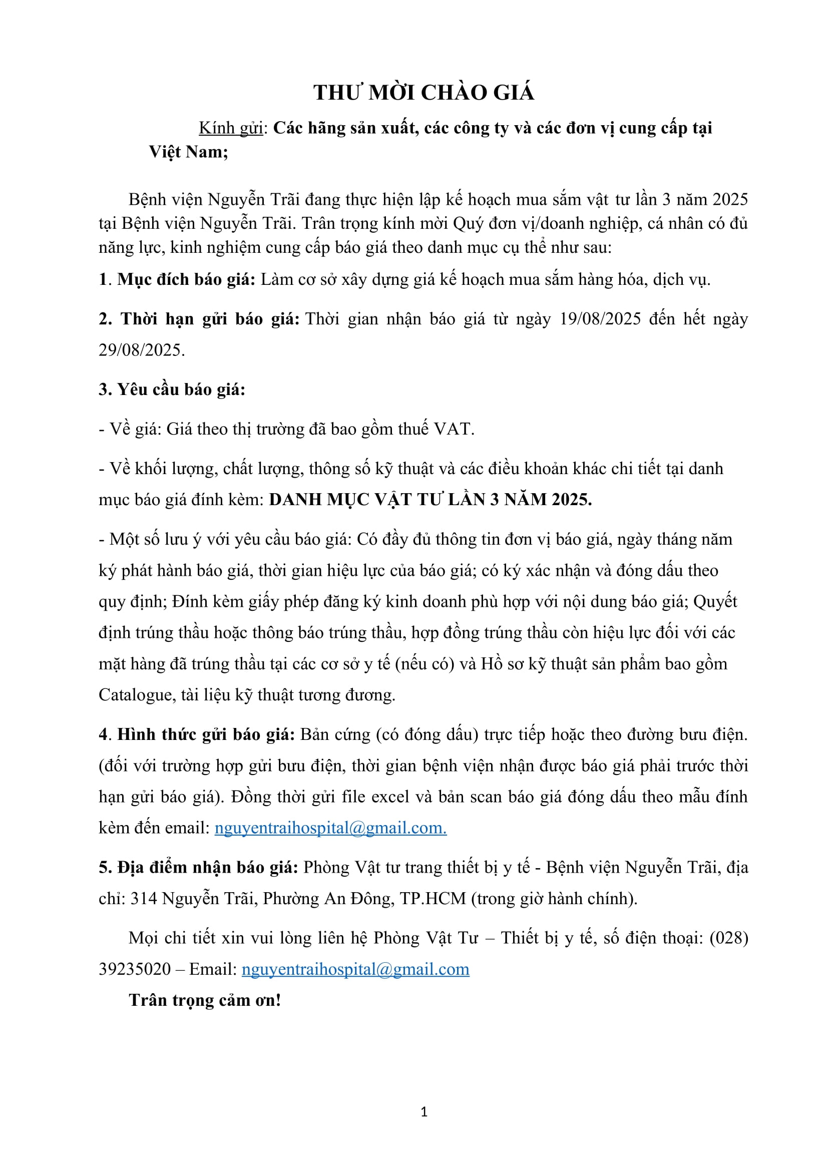 Thư mời chào giá mua sắm vật tư lần 3 năm 2025 tại bệnh viện Nguyễn Trãi
