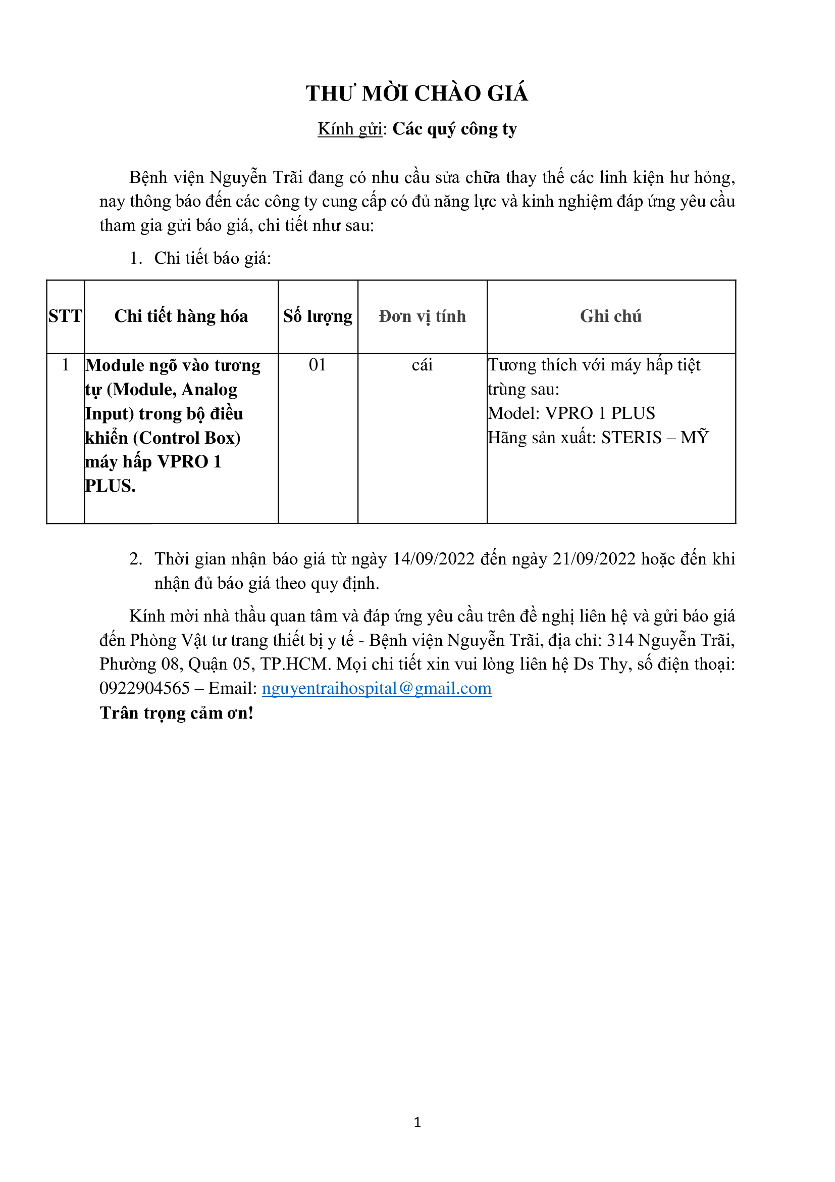 Thư mời chào giá sửa chữa thay thế các linh kiện