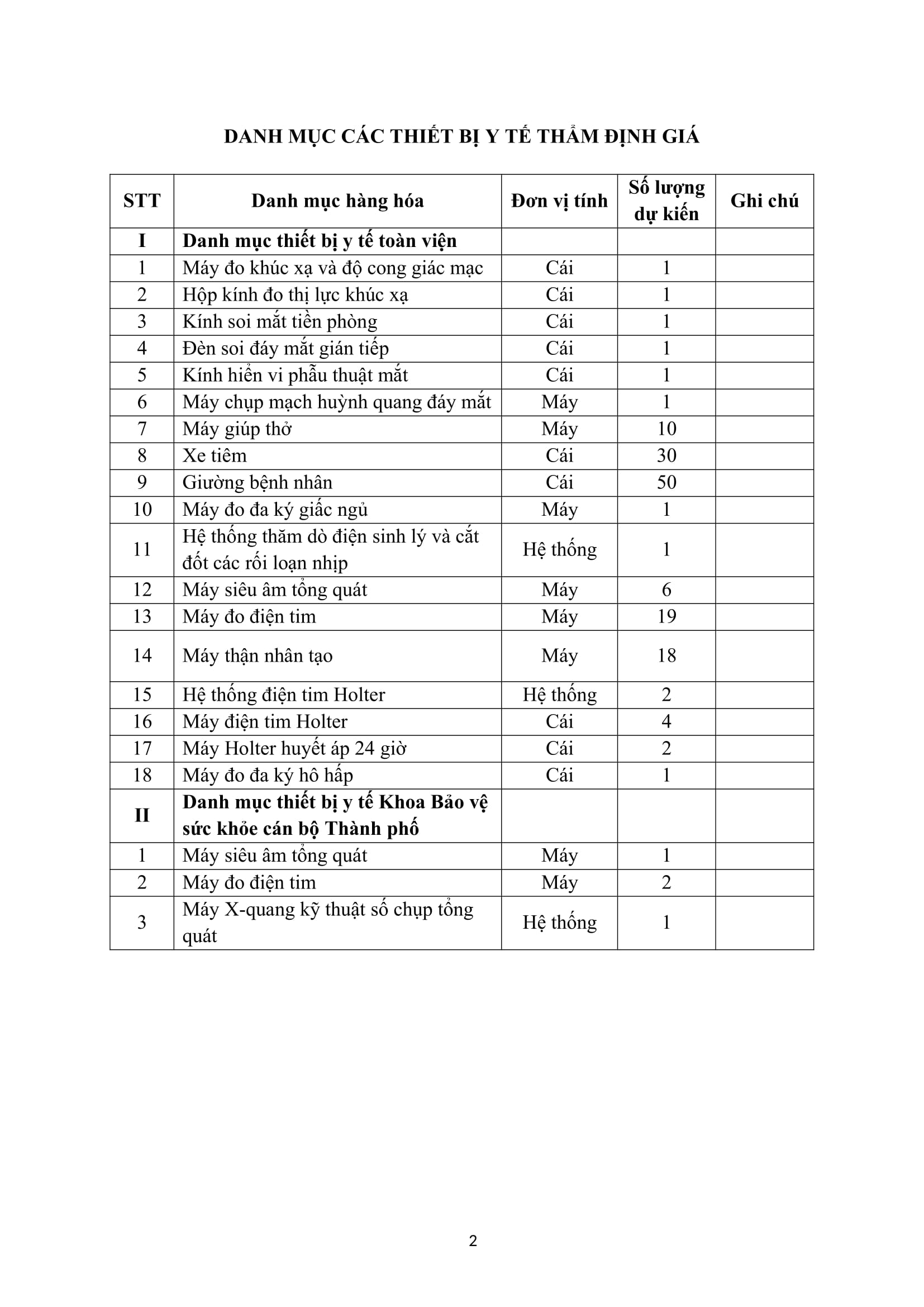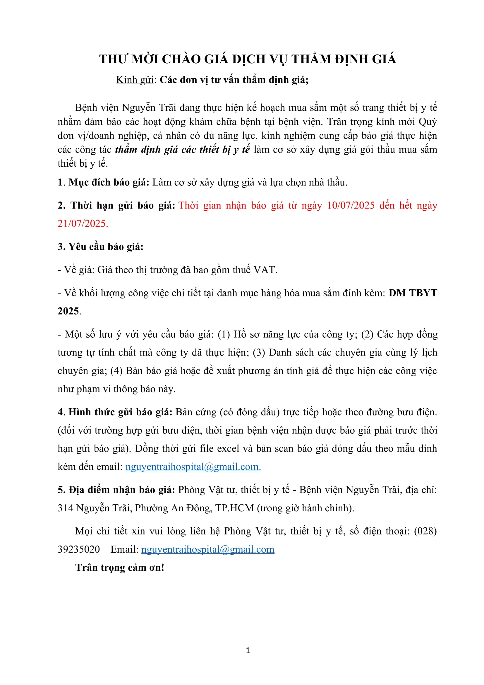 Thư mời chào giá thẩm định giá thiết bị y tế (21 danh mục)